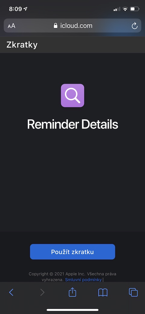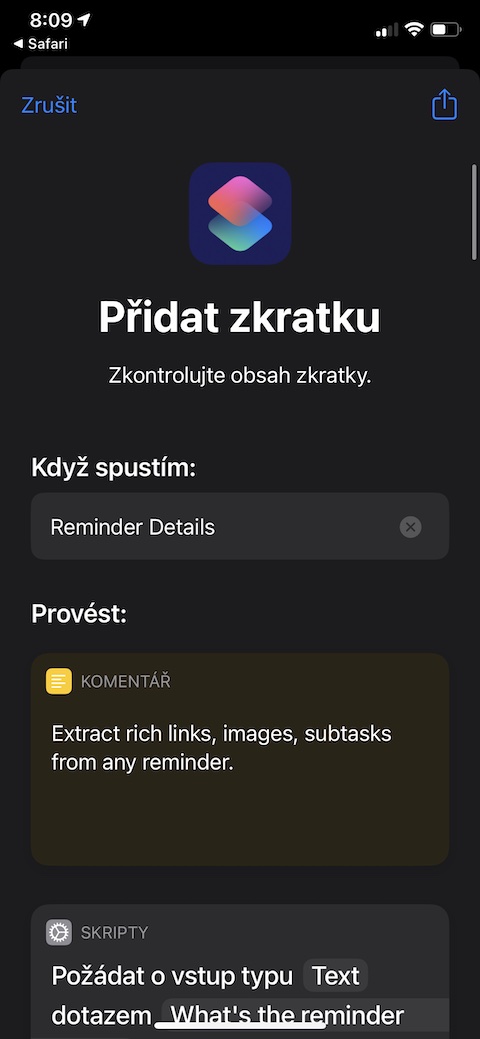 Zkratka s názvem Reminder Details spolupracuje s nativními Připomínkami na vašem iPhonu. Pokud tuto zkratku použijete u vybrané připomínky, můžete z ní rychle a snadno extrahovat odkazy, obrazové přílohy, nebo si prohlédnout vložené připomínky. Aplikace vyžaduje přístup k vašim Připomínkám.