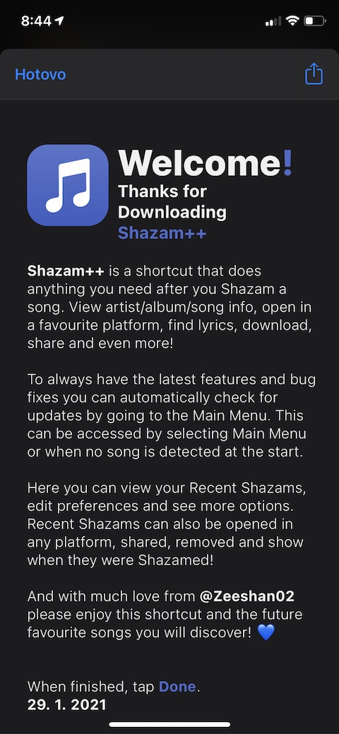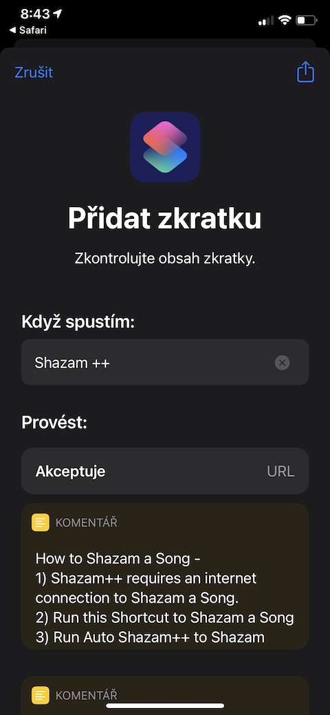 Poslední zkratka z našeho dnešního výběru jistě potěší všechny milovníky hudby a uživatele služby Shazam. S pomocí této zkratky se můžete rozhodnout, jaké další kroky provedete poté, co na svém iPhonu identifikujete libovolnou skladbu za pomoci Shazamu – můžete si zjistit podrobnosti o dané skladbě, otevřít ji ve vybrané aplikaci, sdílet ji, stáhnout, nebo třeba najít její text.
