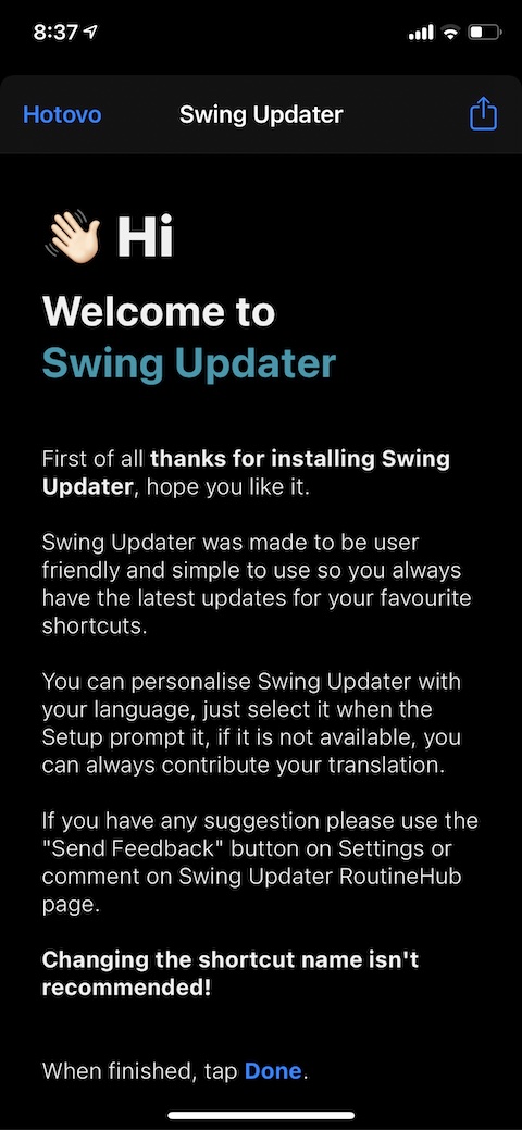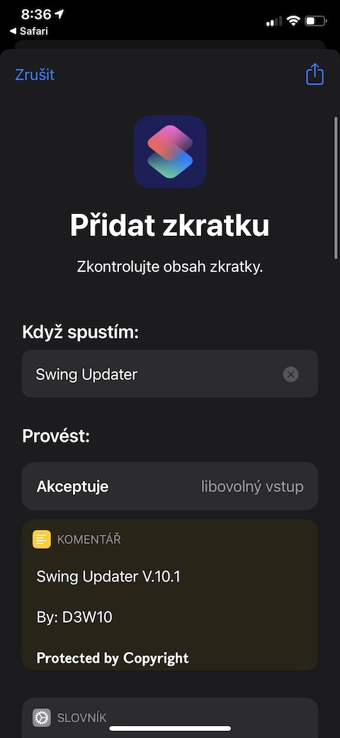 Většina tvůrců zkratek své zkratky více či méně aktualizuje. S aktualizací zkratek, které jste si stáhli do vašeho iPhonu, vám může skvěle pomoci zkratka s názvem Swing Updater. Zkratka vyžaduje přístup k iCloudu a k nativním Zkratkám na vašem iOS zařízení. Kromě aktualizací můžete v rámci této zkratky provádět další nastavení, přidávat nepodporované zkratky nebo vyhledávat zkratky, související se Swing Updater.