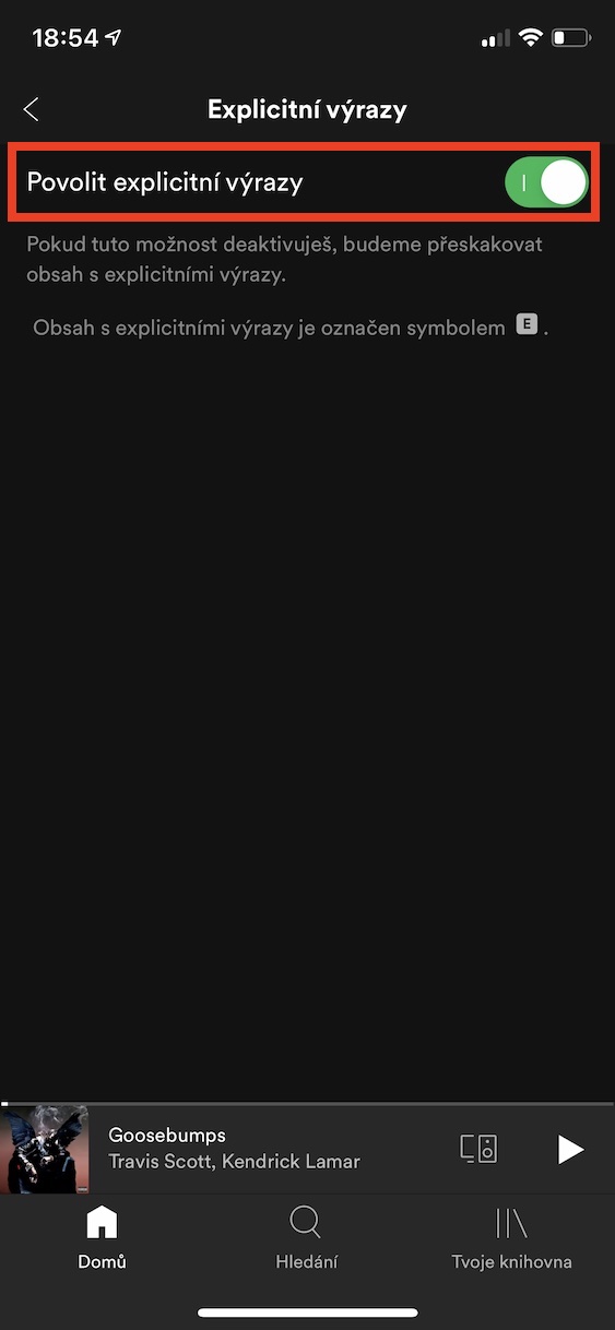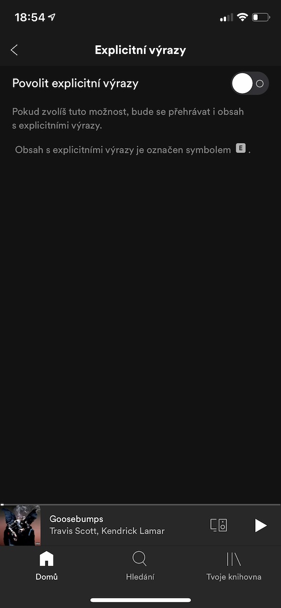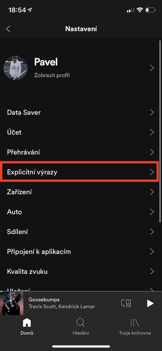 Je naprosto běžné, že se v některých hudebních žánrech v jednotlivých skladbách mohou objevovat různé vulgarismy či jiná forma explicitního obsahu. Pro běžné uživatele se ve většině případech nejedná o nic pohoršujícího, pokud však máte malé děti, tak byste dost možná nechtěli, aby se jim explicitní nahrávky zobrazovaly. I na tyto případy Spotify myslelo a do aplikace přidalo jednoduchou funkci, pomocí které lze přehrávání explicitních skladeb deaktivovat. V tomto případě stačí, abyste se přesunuli na domovskou stránku Spotify, kde vpravo nahoře klepněte na ikonu ozubeného kola. Poté se přesuňte do sekce Explicitní výrazy, kde možnost Povolit explicitní výrazy deaktivujte.