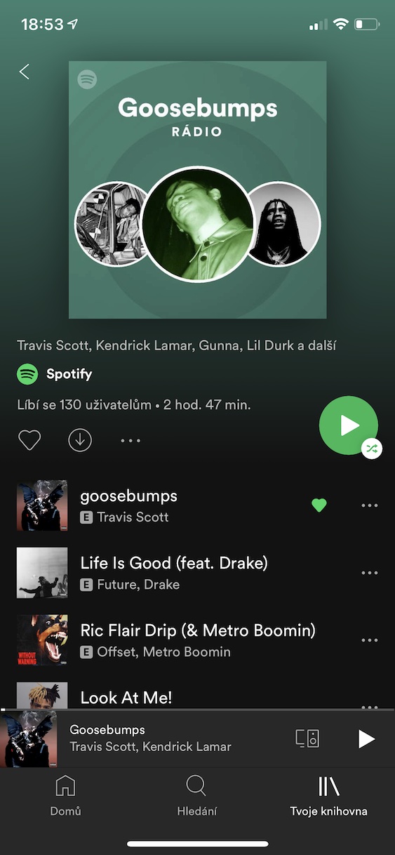 Určitě to každý z vás zná – pustili jste si nějakou novou skladbu a nemůžete se jí nabažit. Co si ale budeme nalhávat, poslouchat neustále dokola jednu a tu samou skladbu není úplně ideální – rychle se vám totiž oposlouchá. Spotify proto přichází s naprosto perfektní funkcí, kterou osobně využívám každý den. Můžete si totiž spustit rádio určité skladby, což znamená, že se vám začne přehrávat playlist skladeb, které jsou si určitým způsobem podobné a mohly by se vám líbit. Nejčastěji se jedná o skladby od podobných interpretů, anebo stejného žánru. Chcete-li rádio nějaké skladby spustit, tak stačí, abyste u ní klepnuli na ikonu tří teček, a poté zvolili možnost Přejít na rádio. Stejně to můžete udělat i u playlistů, čímž si vytvoříte jakýsi „nekonečný playlist“.