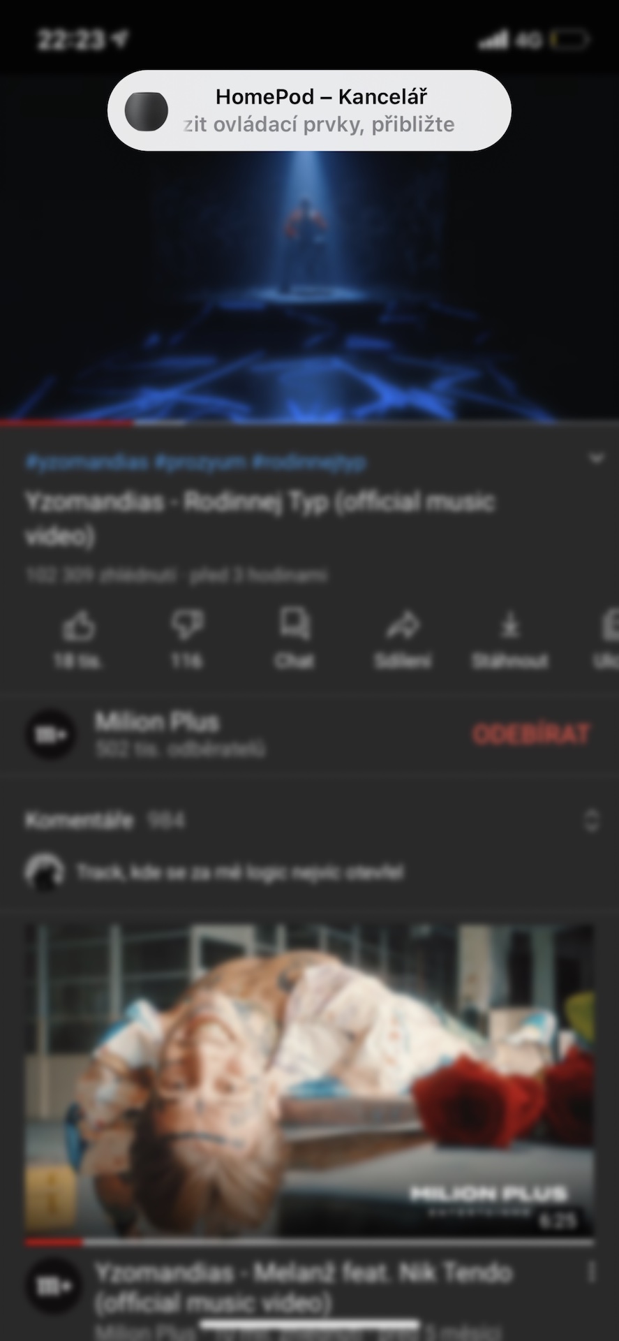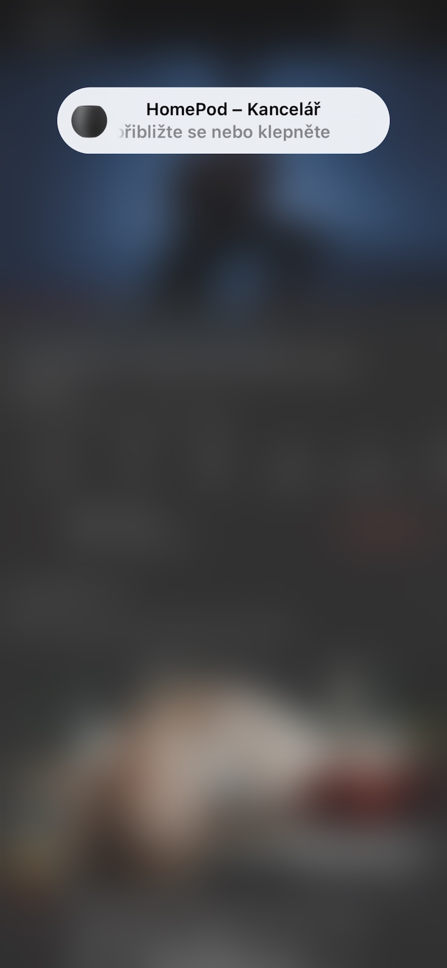 Během úterka jsem měl pocit, že na mě něco leze, a tak jsem si šel lehnout do postele, vedle které mám na nočním stolku HomePod mini. Při tom jsem si přehrával na iPhone video a najednou se mi začal displej telefonu rozmazávat. První, co mě napadlo bylo, že je to konec a umírám nebo tak něco. Naštěstí, když jsem s telefonem pohnul, zjistil jsem, že to se mnou není až tak zlé, ale že se jedná o novou funkci iOS a HomePodu mini, která vás na HomePod v bezprostředním dosahu vašeho iPhone upozorní jednak rozmazáním displeje, ale také tím, že telefon začne reagovat haptickou odezvou a v horní části displeje se zobrazí informace o tom, že můžete zvuk automaticky přesunout na HomePod.