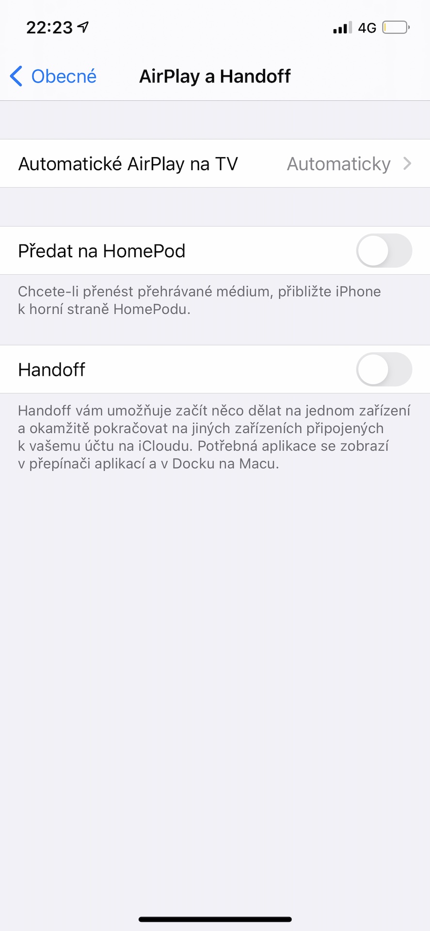 Funkce je to sice zajímavá, ale pokud máte HomePod třeba na nočním stolku a pouštíte si hudbu nebo video do AirPods, je poměrně otravná, a navíc nestačí jen potvrdit, že nemáte o přenos zvuku zájem, ale HomePod vás bude otravovat pořád dokola, dokud iPhone nedáte fyzicky z jeho blízkosti pryč. Naštěstí je možnost tuto funkci kompletně ukončit. Stačí, když přejdete ve vašem iPhone do Nastavení – Obecné a zvolíte možnost AirPlay a Handoff. Zde pak vyberte položku Předat na HomePod a tu deaktivujte. Nyní již nebude iPhone s předáním zvuku na HomePod otravovat. Funkci je samozřejmě možné stejným způsobem kdykoli opět aktivovat.