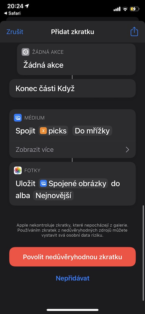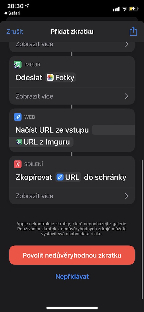 Se závěrem týdne přichází opět naše pravidelná várka zajímavých zkratek pro iOS. Tentokrát si představíme například zkratku pro vytváření koláží fotografií, přehrávání skladeb v Apple Music nebo třeba vkládání fotografií na web Imgur. Abyste mohli každou zkratku úspěšně nainstalovat a spustit, otevřete příslušné odkazy vždy v prostředí prohlížeče Safari na iPhonu, do kterého chcete zkratku nainstalovat. Ujistěte se také, že jste v Nastavení -> Zkratky povolili používání nedůvěryhodných zkratek.