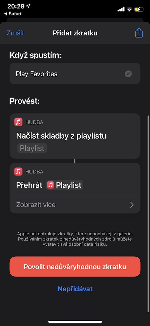Pro přehrání seznamu vašich oblíbených skladeb nemusíte pokaždé nutně spouštět příslušnou streamovací aplikaci. Pokud si stáhnete a nainstalujete zkratku s názvem Play Favorites, můžete s její pomocí kdykoliv a kdekoliv zahájit přehrávání seznamu vašich oblíbených skladeb z aplikace Apple Music v náhodném pořadí.