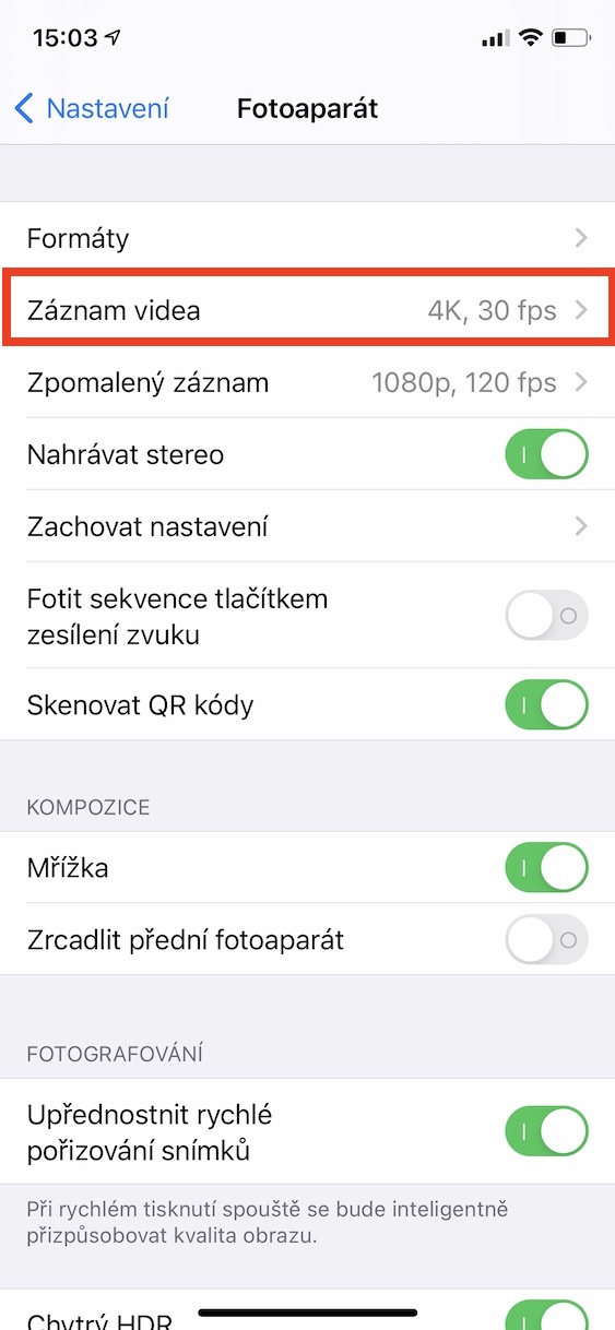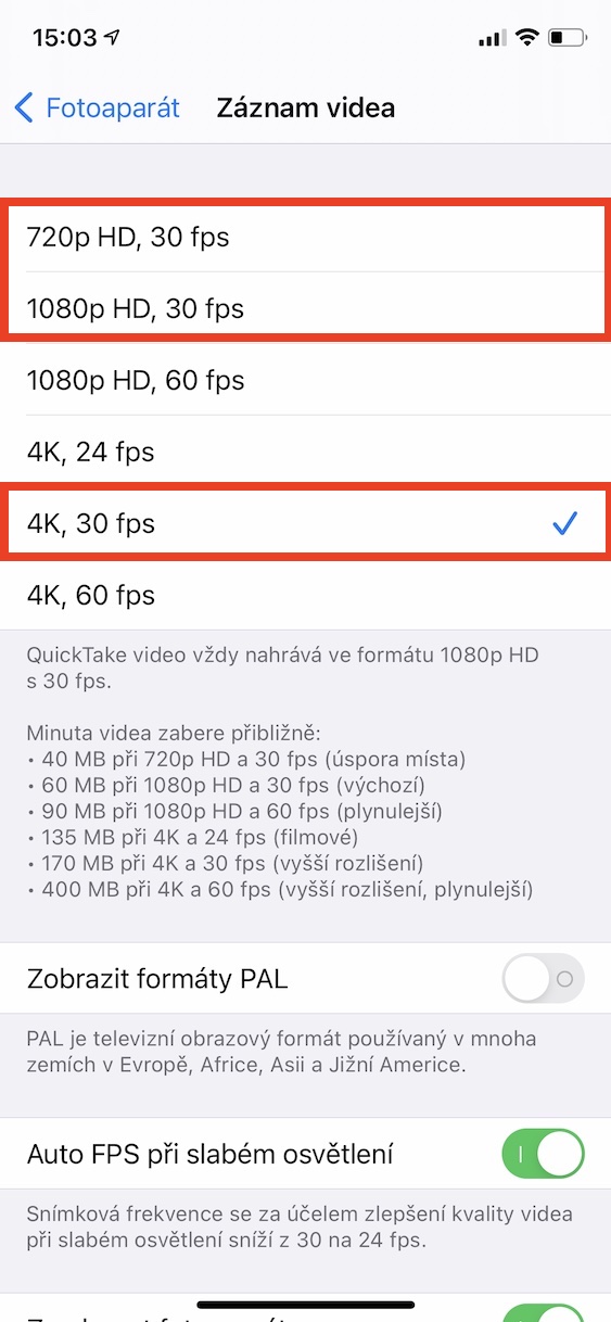 Jak na iPhone deaktivovat Auto FPS při točení ve špatných světelných podmínkách