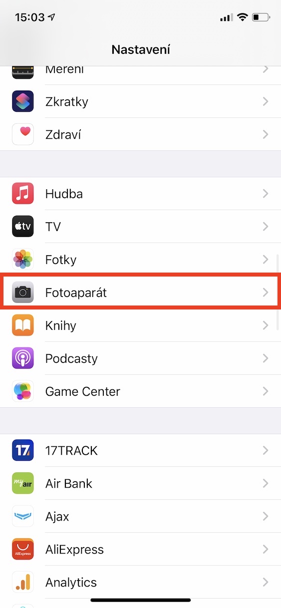 • Jakmile tak učiníte, tak sjeďte o kus níže k možnosti Fotoaparát, kterou rozklikněte.