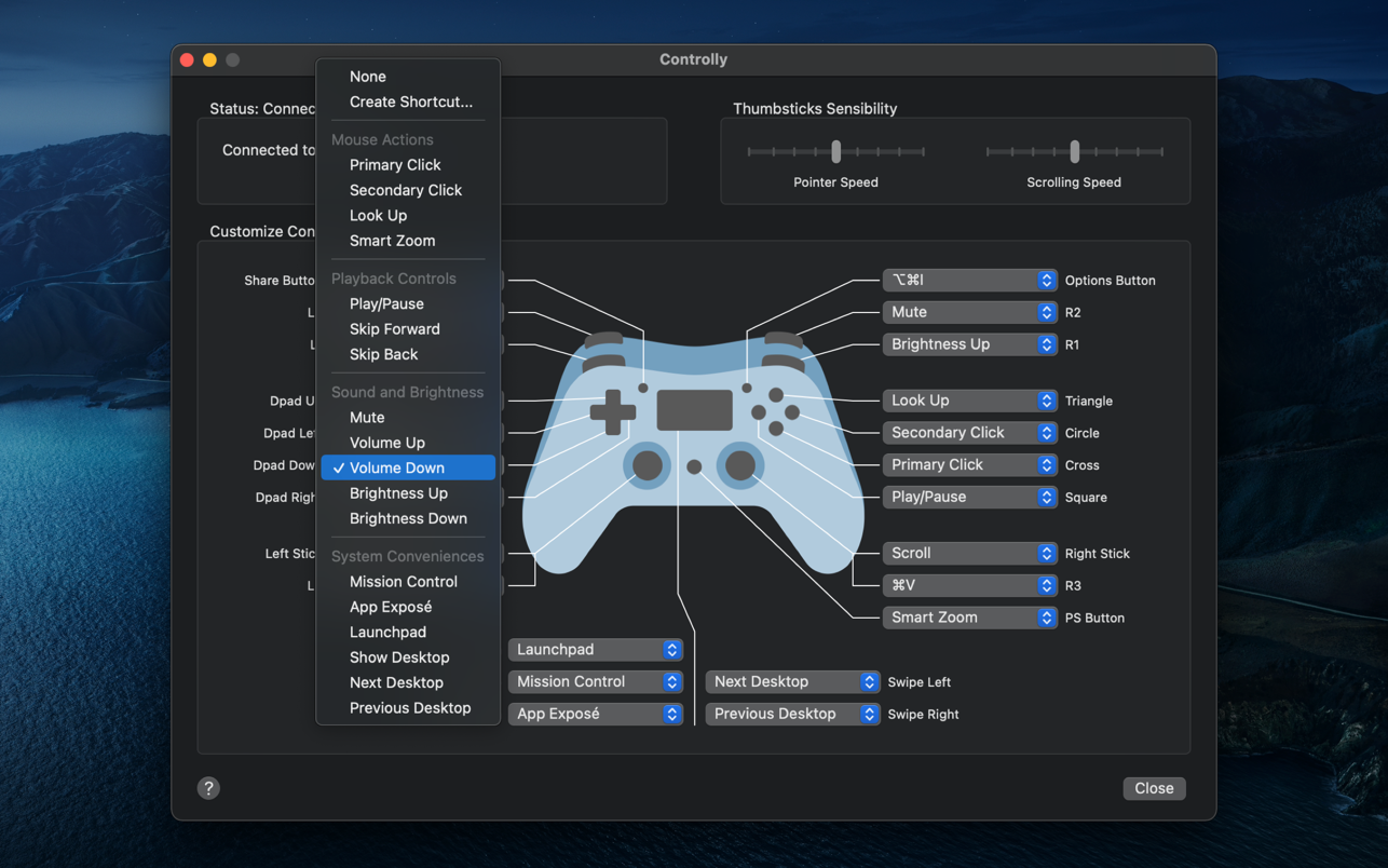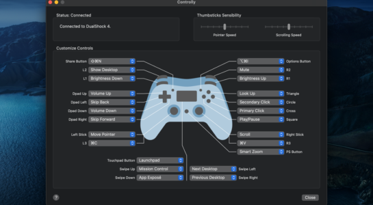 Aplikace dokáže na ovladač simulovat kliky interakci s myší, funkce multimediálního přehrávání (play/pause/skip), základní ovládací funkce (úroveň hlasitosti, ztlumení, ovládání jasu) a zároveň i poněkud omezené možnosti ovládání systémových nástrojů a funkcí, jako je třeba Launchpad, zobrazení plochy a jejich přepínání máte-li jich aktivních více, přepínání připojených monitorů a další. Na analogové páčky je pak možné namapovat pohyb kurzoru nebo scrollování. Autoři aplikace nabízí sedmidenní trial k vyzkoušení, pokud vás aplikace zaujme, pro její další používání je třeba zaplatit poplatek 4EUR/99 Kč.