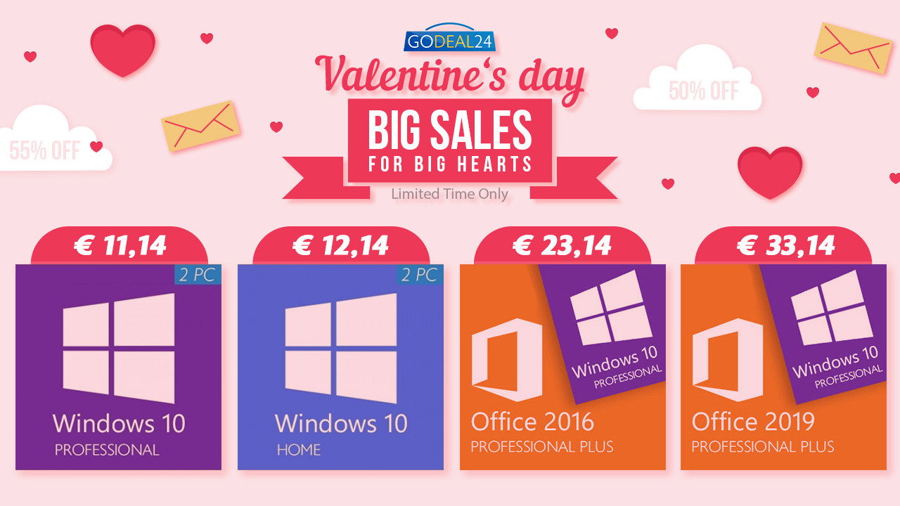 Godeal24.com je jedním z největších a nejspolehlivějších online obchodů, který se specializuje na prodej softwarových licencí za ty nejúžasnější ceny, přičemž se pyšní bleskurychlým dodáním skrze e-mail. Při příležitosti letošního svátku svatého Valentýna navíc odstartovali Valentýnské obří slevy, kdy můžete ušetřit až 88 %.