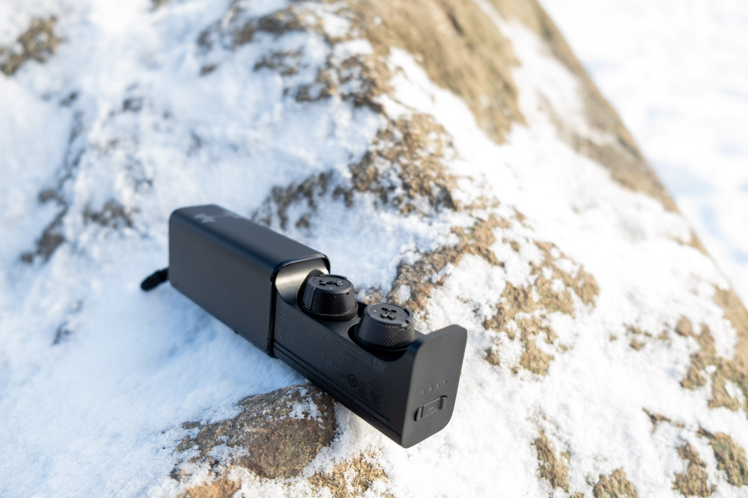 Nabíjecí krabička disponuje hliníkovým obalem, vnitřní část je plastová. Sluchátka do svých nabíjecích pozic skvěle a pevně zapadnou, mechanismus otvírání se zavírá s velice příjemným zaklapnutím pojízdné části. Na obalu najdeme i poutko při případ, že byste si chtěli sluchátka připnout za pomocí karabiny například k batohu.