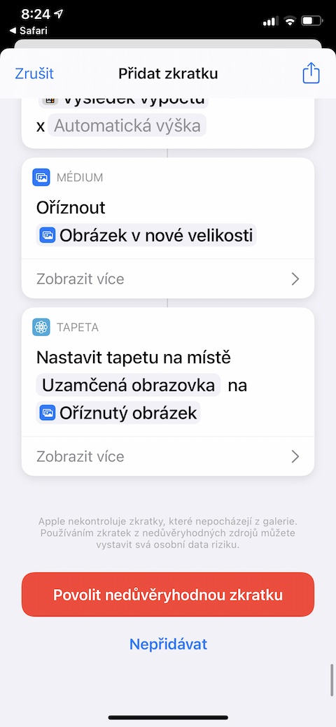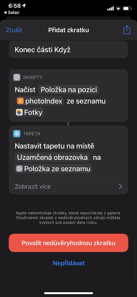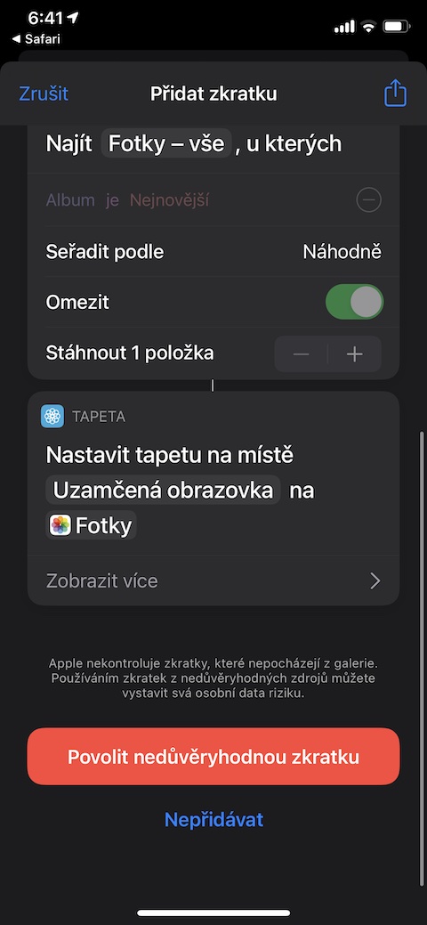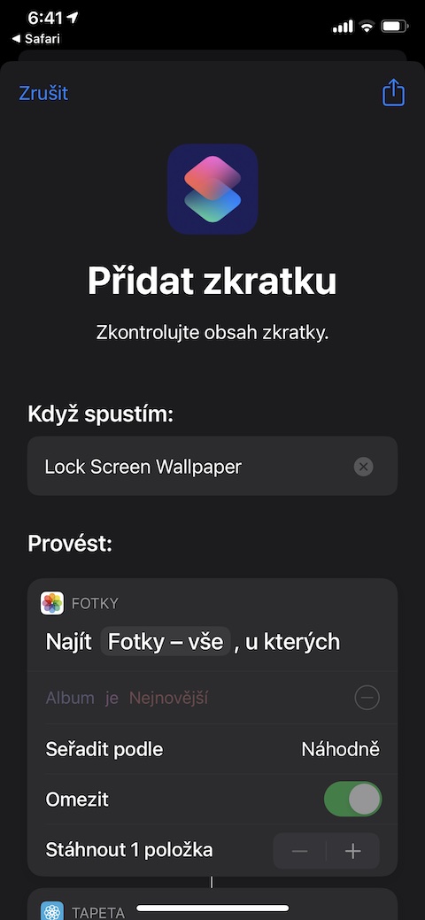 Zkratka s názvem Lock Screen Wallper automaticky vybere z alba ve fotogalerii na vašem iPhonu náhodnou fotografii a nastaví ji jako tapetu na vaši uzamčenou obrazovku. Ve výchozím nastavení je jako zdrojové album nastaveno album s nejnovějšími fotkami – doporučujeme vám vytvořit si vlastní album s tapetami, po instalaci zkratky klepnout na tři tečky v pravém horním rohu její karty a změnit zdrojové album. Zkratka vyžaduje přístup k aplikaci Fotky na vašem iPhonu.