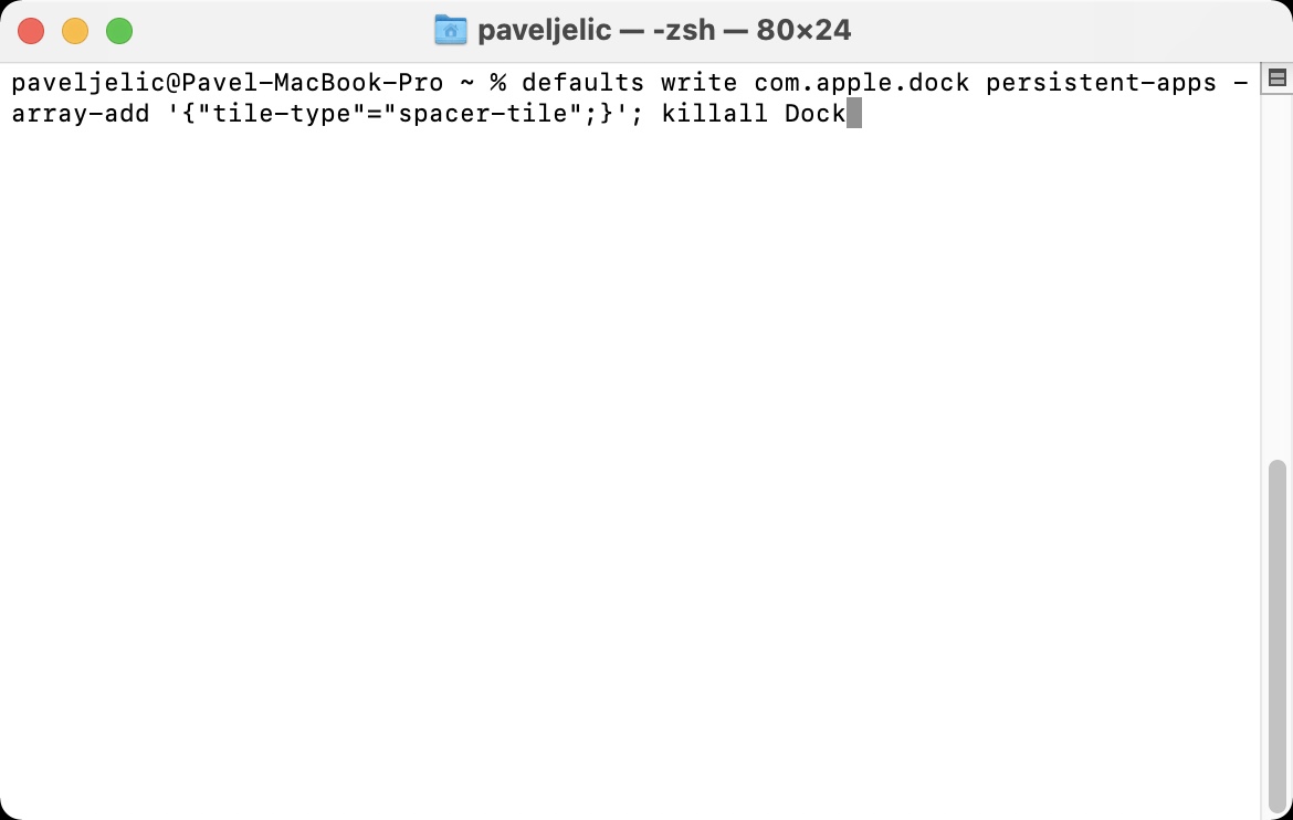 defaults write com.apple.dock persistent-apps -array-add '{"tile-type"="spacer-tile";}'; killall Dock