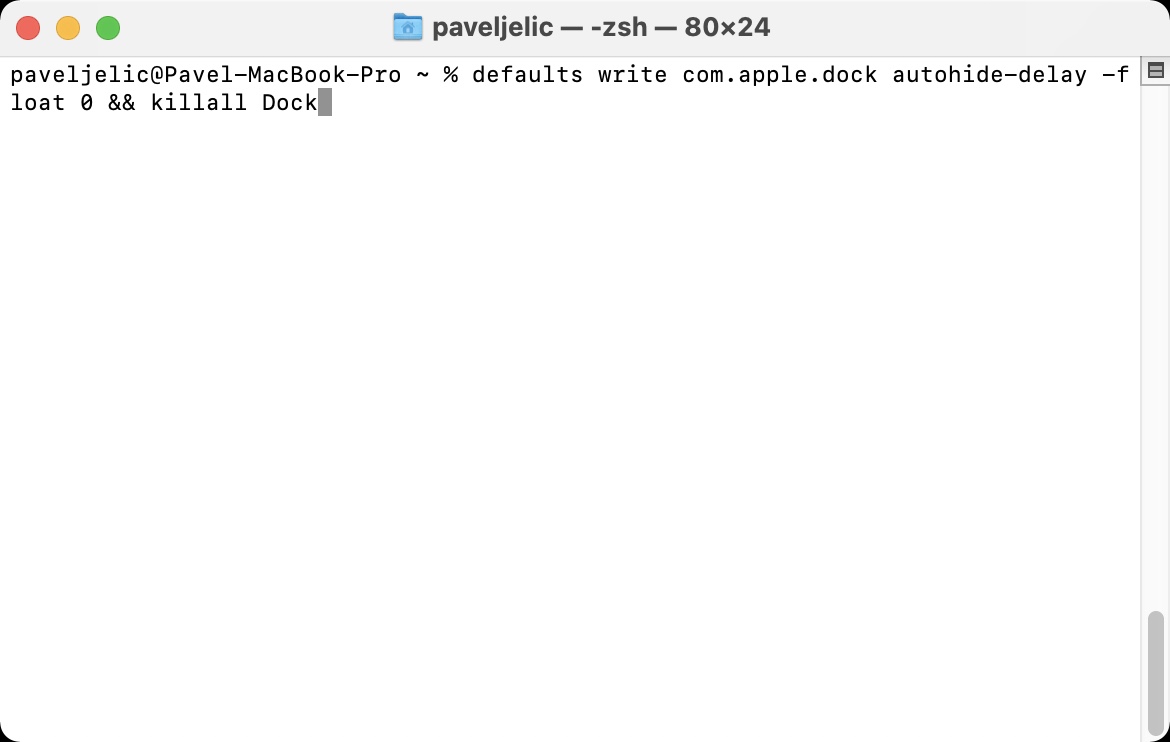 defaults write com.apple.dock autohide-delay -float 0 && killall Dock