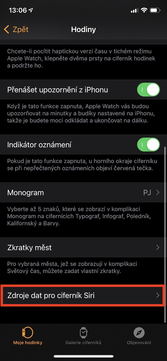 - V rámci této sekce se poté přesuňte úplně dolů a rozklikněte možnost Zdroje dat pro ciferník Siri.