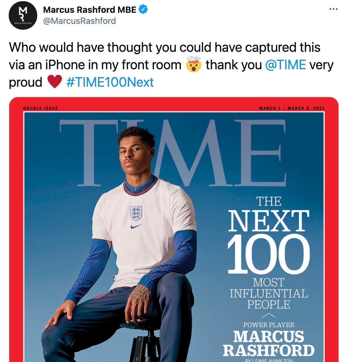 Fotografie, pořízené iPhonem, už dávno nejsou považované za nekvalitní a nouzové snímky. iPhony ke své práci často využívají profesionální fotografové, filmaři, nebo třeba novináři, a nyní se snímek z iPhonu dostal dokonce na titulní stránku magazínu Time. Na fotografii se nachází fotbalista Marcus Rashford, který je považován za jednu ze stovky nejvlivnějších osobností. Rashford je kromě jiného ceněn také pro své aktivity na poli boje s bezdomovectvím, hladem a chudobou.