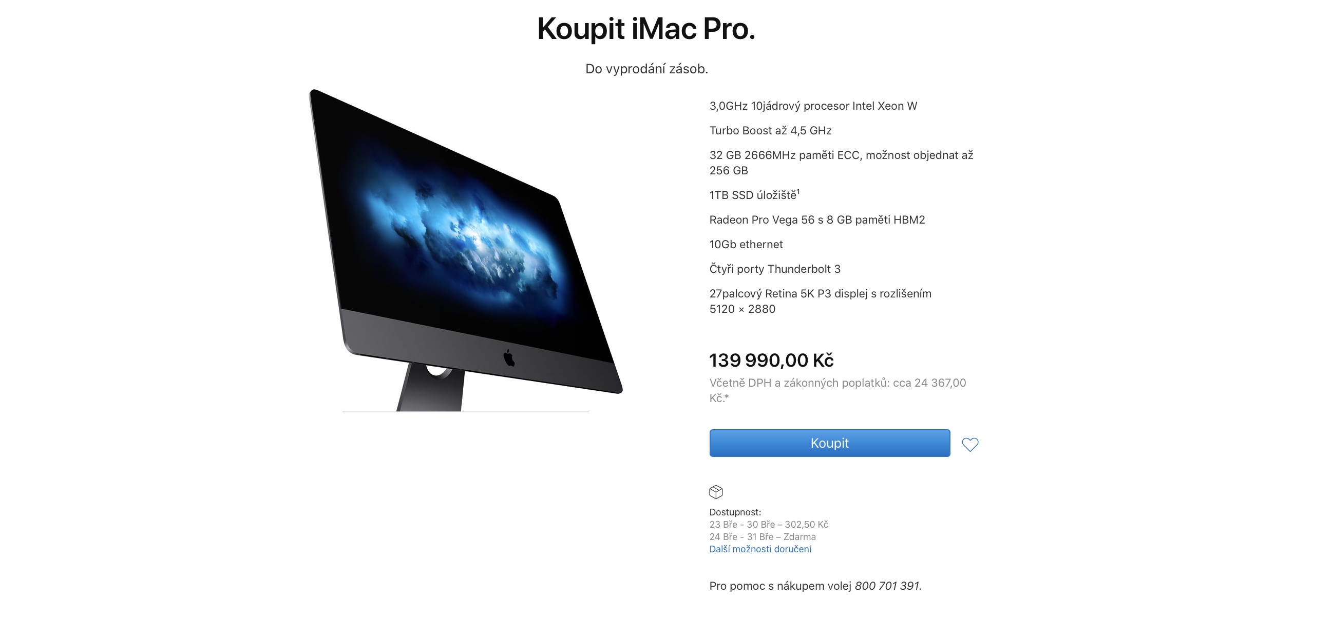 Když začal Apple v prosinci 2017 iMac Pro prodávat, za vrcholnou konfiguraci si účtoval více než 400 000 Kč. V současnosti si jej nicméně můžete od kalifornského giganta zakoupit jen v “základní” variantě nabízející 3,0GHz 10jádrový procesor Intel Xeon W s Turbo Boostem až 4,5 GHz, 32GB RAM, 1TB SSD disk, grafiku Radeon Pro Vega 56 s 8 GB paměti HBM2 či 10Gb ethernet za 139 990 Kč. Změnu jakéhokoliv komponentu totiž už Online Store neumožňuje. Zároveň na něm pak naleznete i zprávu “Do vyprodání zásob”, ze které jasně plyne, že se nemožnost konfigurace netočí například kolem problémů s výrobou komponentů, ale že je Apple stroje v této verzi v dohledné době ukončit. Jak velké skladové zásoby jsou k dispozici sice jasné není, s ohledem na povahu produktu je však velmi pravděpodobné, že se bavíme o nižších jednotkách kusů.