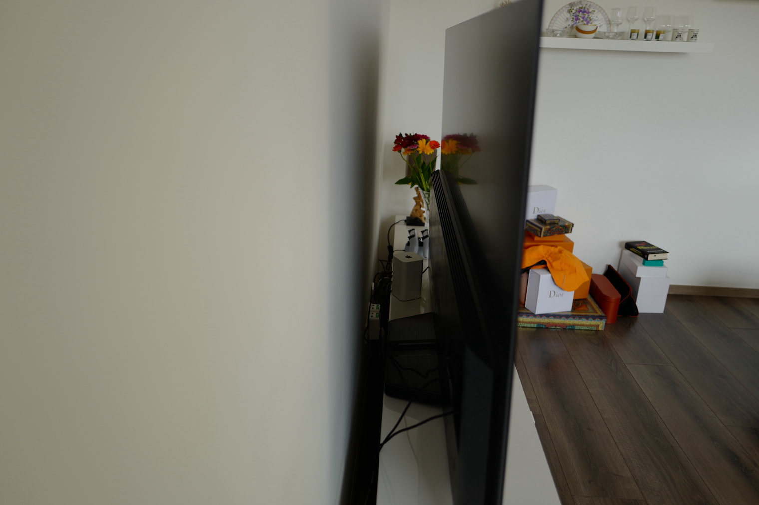 Zhruba 2/3 celé plochy obrazovky jsou skutečně tenčí než iPhone, ale poslední třetina obsahující veškeré porty a elektroniku je tlustá zhruba 4 cm. Stojan je pak hluboký 27 centimetrů, a tak je potřeba myslet na to, že vzhledem k tomu, že drtivá většina z těchto 27 centimetrů je umístěna za obrazovkou, nemůžete televizor, respektive jeho obrazovku dát příliš blízko zdi, ale vždy bude zhruba 20 centimetrů od zdi.