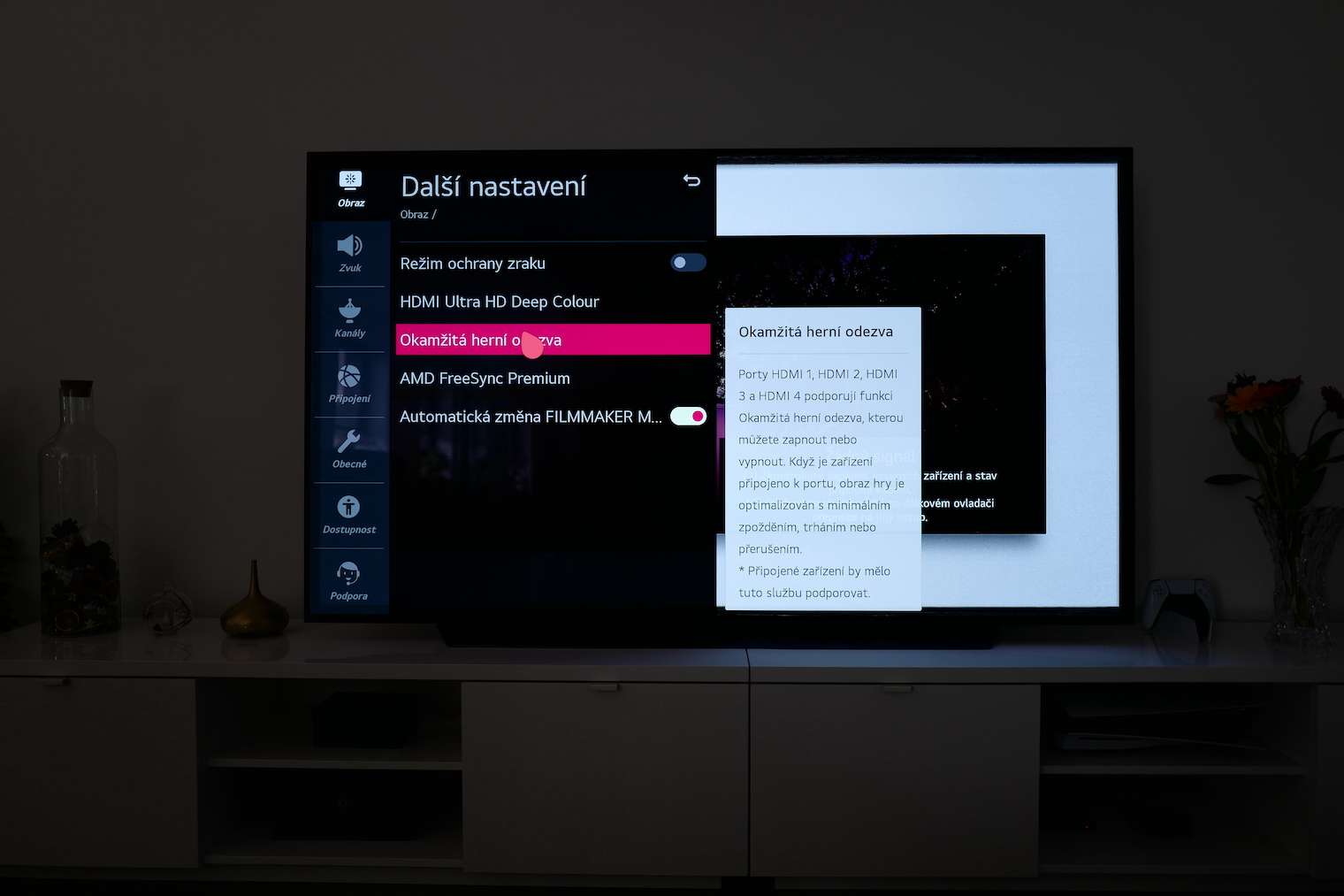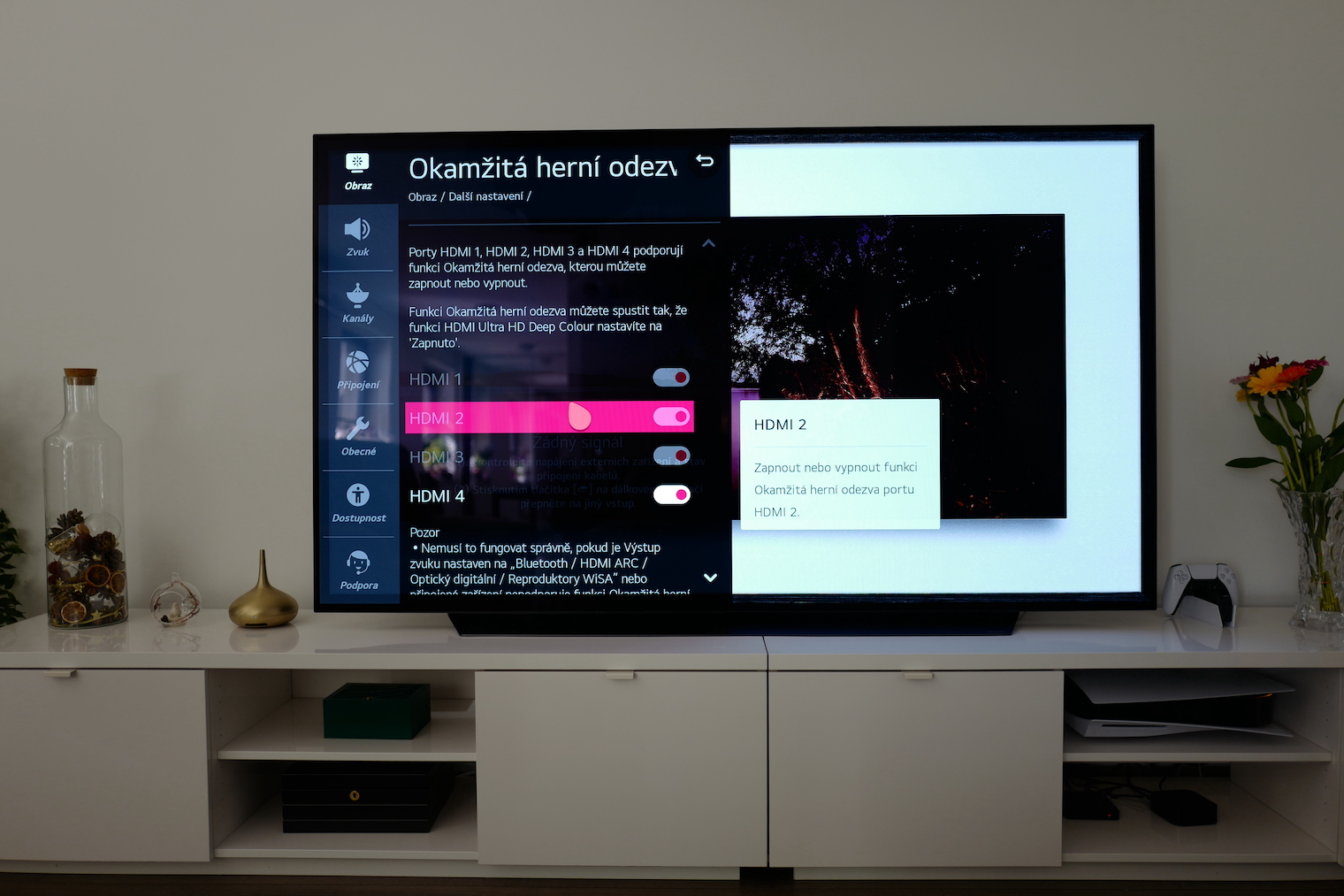 Jak jsem již zmínil, tím, co mě donutilo pořídit si nový televizor byla právě nová konzole Playstation 5, kterou již nemělo cenu do mého předchozího televizoru zapojovat. A právě proto mi záleželo kromě obrazové kvality především na tom, jakými porty bude nový televizor disponovat. Abyste totiž mohli využít všechny vymoženosti nejnovějších konzolí a nejen jich, potřebujete mít televizor vybavený porty HDMI 2.1. Velkou výhodou a jednou z věcí, které se mi na televizoru skutečně líbí je fakt, že když LG uvádí, že televizor disponuje HDMI 2.1, tak to platí pro všechny 4 porty HDMI, kterými televizor disponuje. Ne zřídka se totiž stává, že výrobce sice uvede, že nabízí HDMI 2.1, ale týká se to pouze jednoho portu a zbytek funguje na HDMI 2.0 nebo dokonce HDMI 1.4. U LG CX tedy nemusím vůbec řešit, jaká zařízení, do jakého portu připojím, vždy mám nejlepší možný výsledek. Osobně jsem si říkal, že televizor je věc, kterou nebudu dalších třeba deset let měnit, a tak jsem se rozhodl investovat i do kabeláže. K televizoru mám připojený 4K Set-Top box, Apple TV 4K a také Playstation 5. Vše jsem připojil pomocí kabelů Belkin Ultra HD High Speed 8K HDMI 2.1, které jednak nabízí nejlepší možnou kvalitu přenosu signálu, ale také jsou pletené a dá se s nimi skvěle vytvořit kabel managment za televizorem.