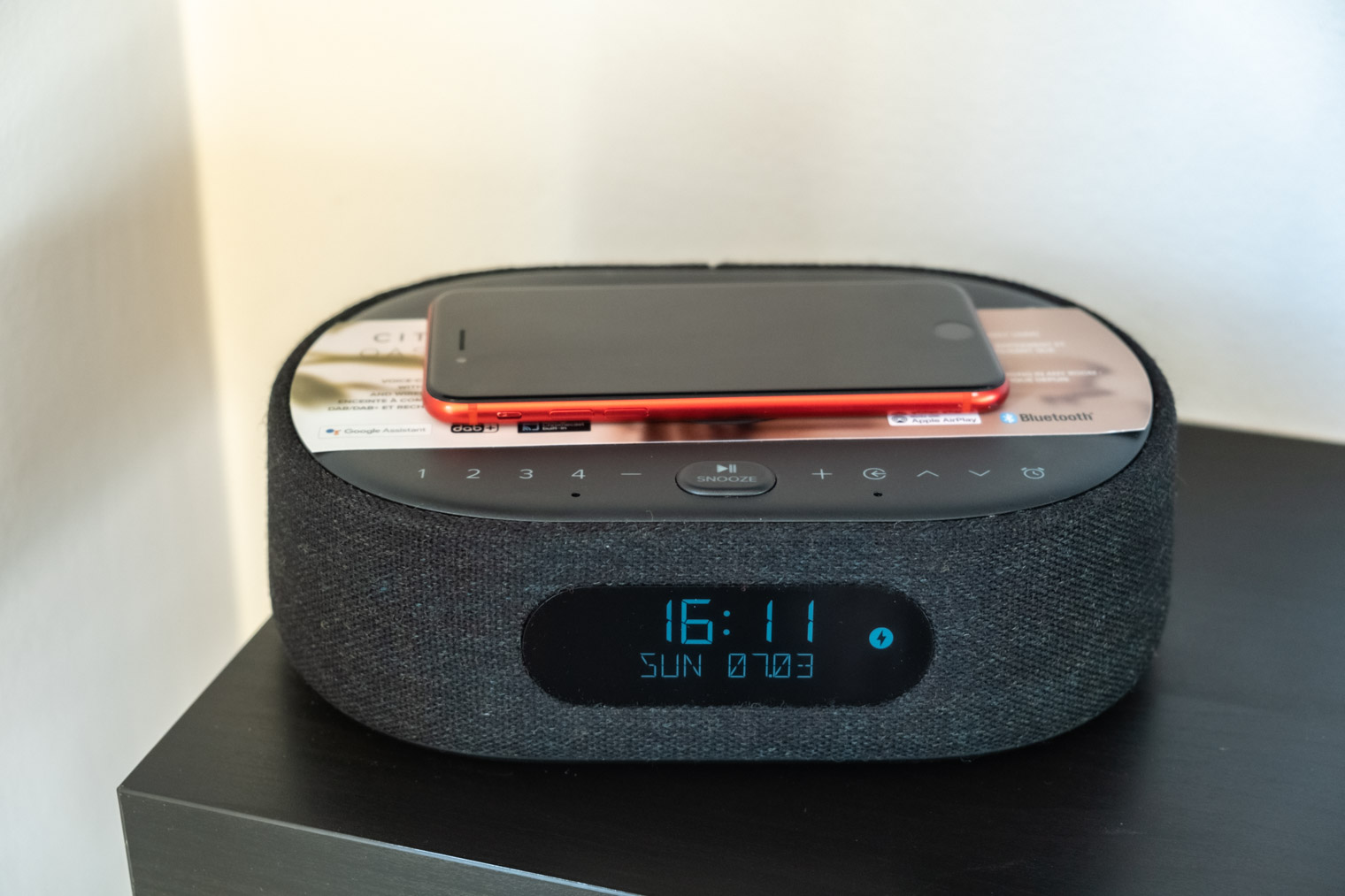 Boční stěny reproduktoru/budíku jsou pokryté látkou, která zařízení dokola obepíná. Výjimkou je jen výřez na čelní straně, na které se nachází displej, jež dokáže zobrazit všechny podstatné informace od času, přehrávané hudby, aktivovaných budíků, připojení k WiFi či přes Bluetooth, název přehrávané písničky či naladěného rádia a jeho frekvenci. Na zadní straně zařízení najdeme několik důležitých ovladačů a konektorů, mezi které patří zdířka pro napájení a připojení DAB antény, dále pak USB konektor pro nabíjení připojeného zařízení, AUX konektor a trojici fyzických tlačítek. Jedním z nich se ovládá jas displeje, druhý fyzicky vypíná vestavěné mikrofony a třetí vypíná Wi-Fi což může potěšit ty, kdo nechtějí spát vedle aktivního Wi-Fi zařízení. Nachází se zde také servisní microUSB konektor.