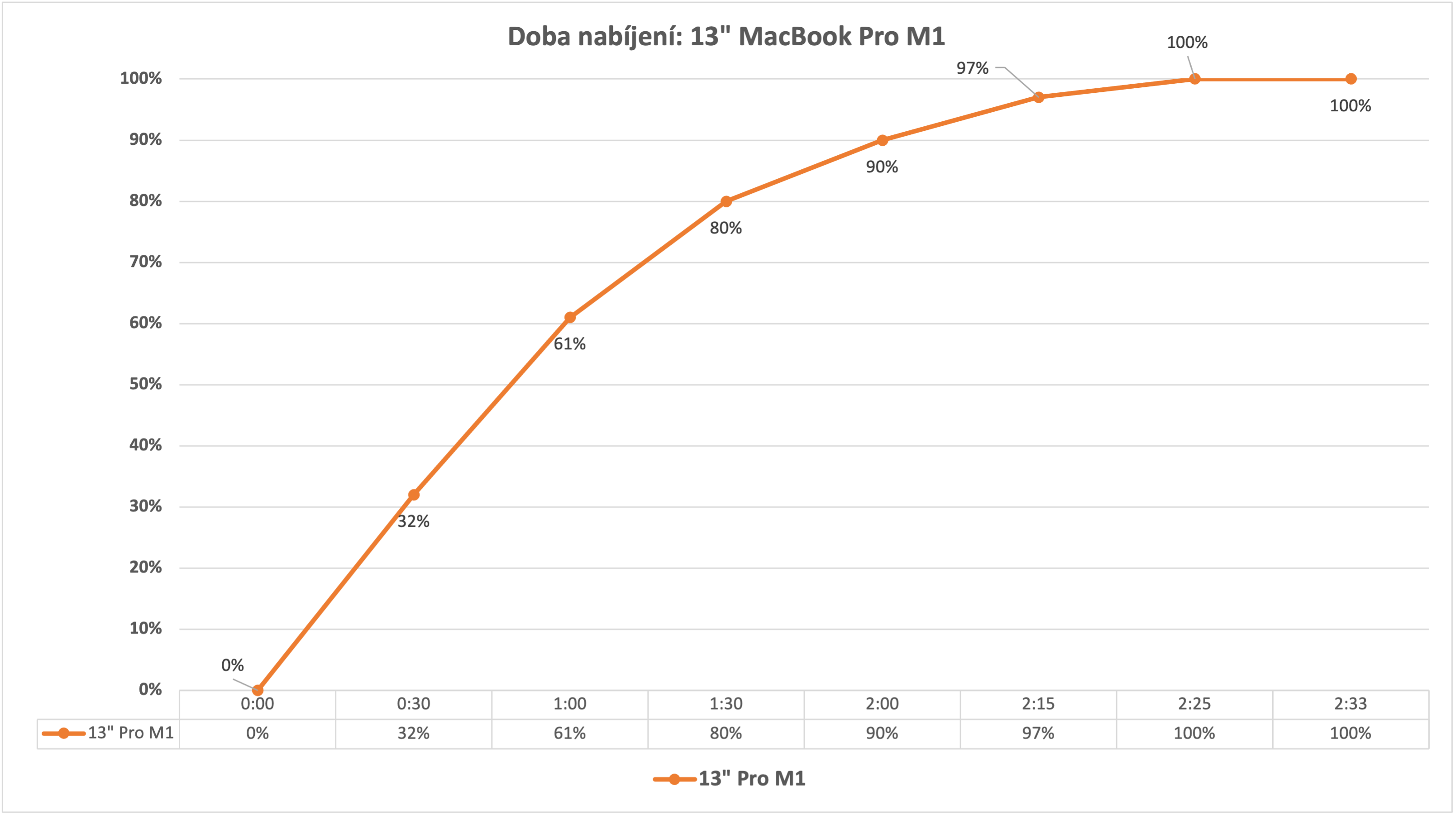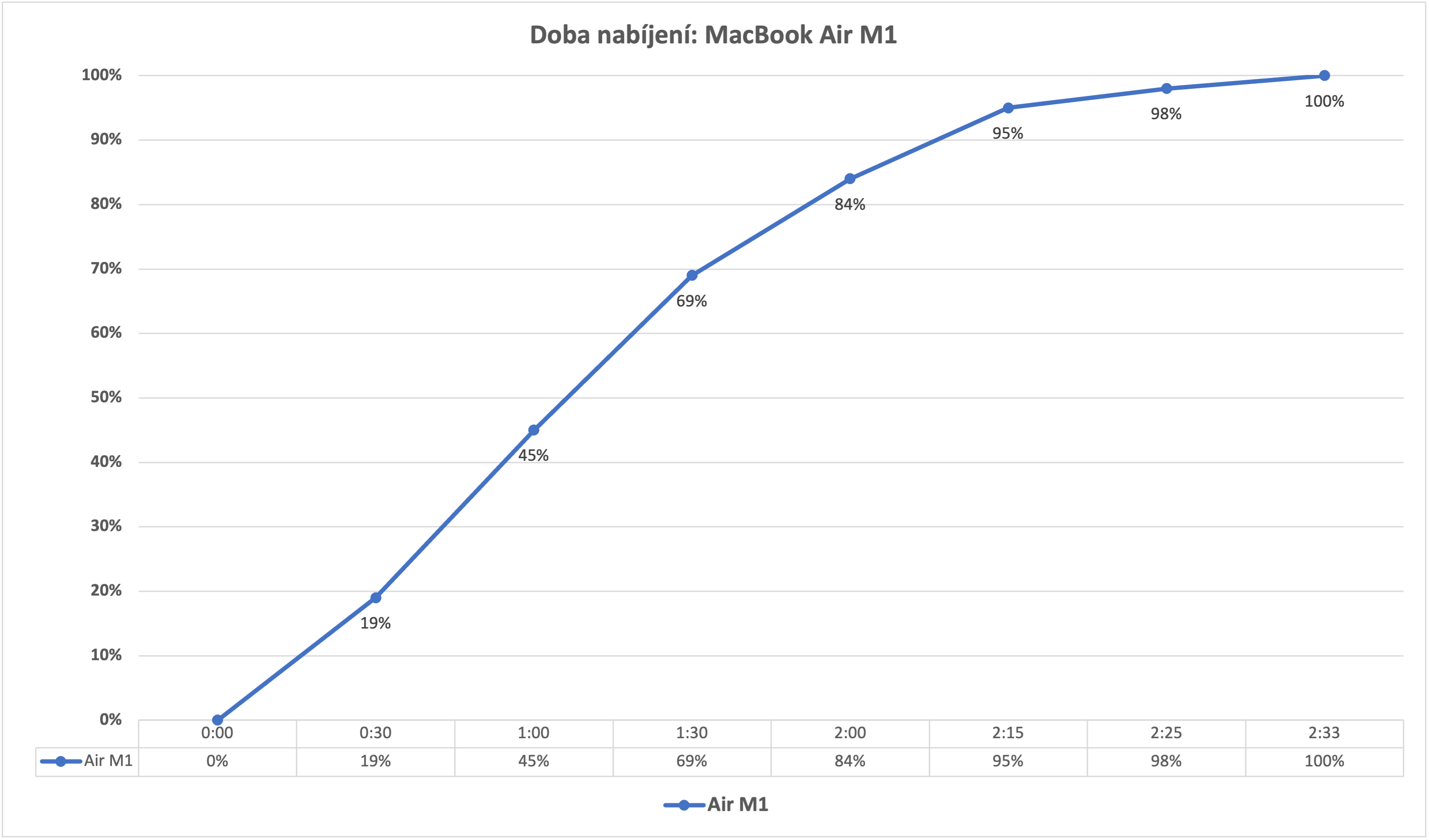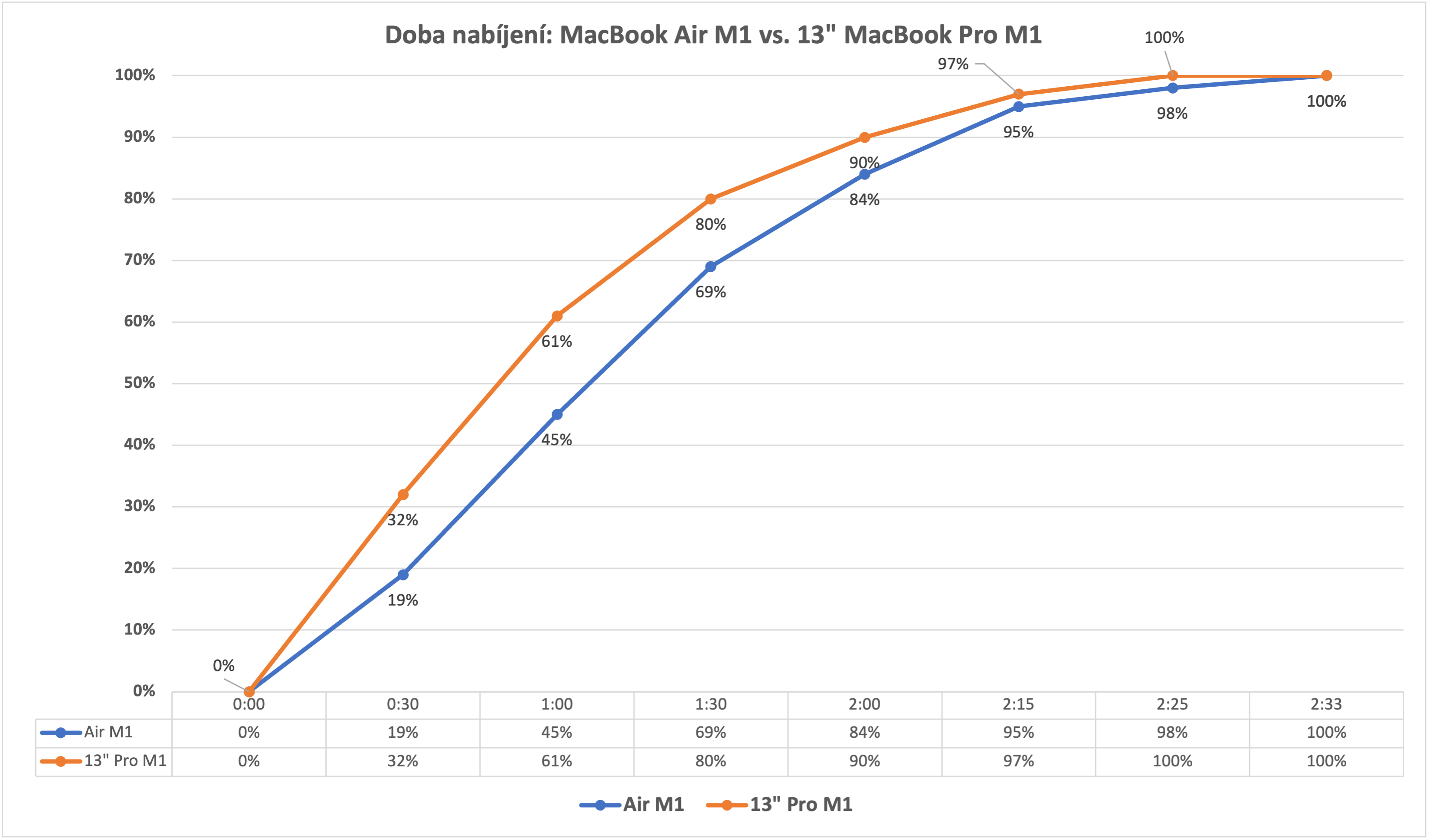 Jak jste si mohli na grafech všimnout, tak z počátku měl při nabíjení 13″ MacBook Pro M1 výrazně navrch – zhruba o 15 %. Poté, co se oba dva MacBooky s M1 nabily přes 50 %, tak se procenta nabití začala srovnávat. Nakonec to dopadlo tak, že se MacBook Air M1 nabil na 100 % pouze o 8 minut později. Celková doba nabíjení MacBooku Air byla 2 hodiny a 33 minut, v případě 13″ MacBooku Pro poté 2 hodiny a 25 minut. Nutno podotknout, že při nabíjení nebyly MacBooky používány a měly zavřené víko. Po půl hodinách bylo vždy víko otevřeno pouze ke kontrole stavu nabití. Za zhruba 2,5 hodiny jste tedy schopni nabít oba dva MacBooky, které disponují čipem M1, což je naprosto obdivuhodné.