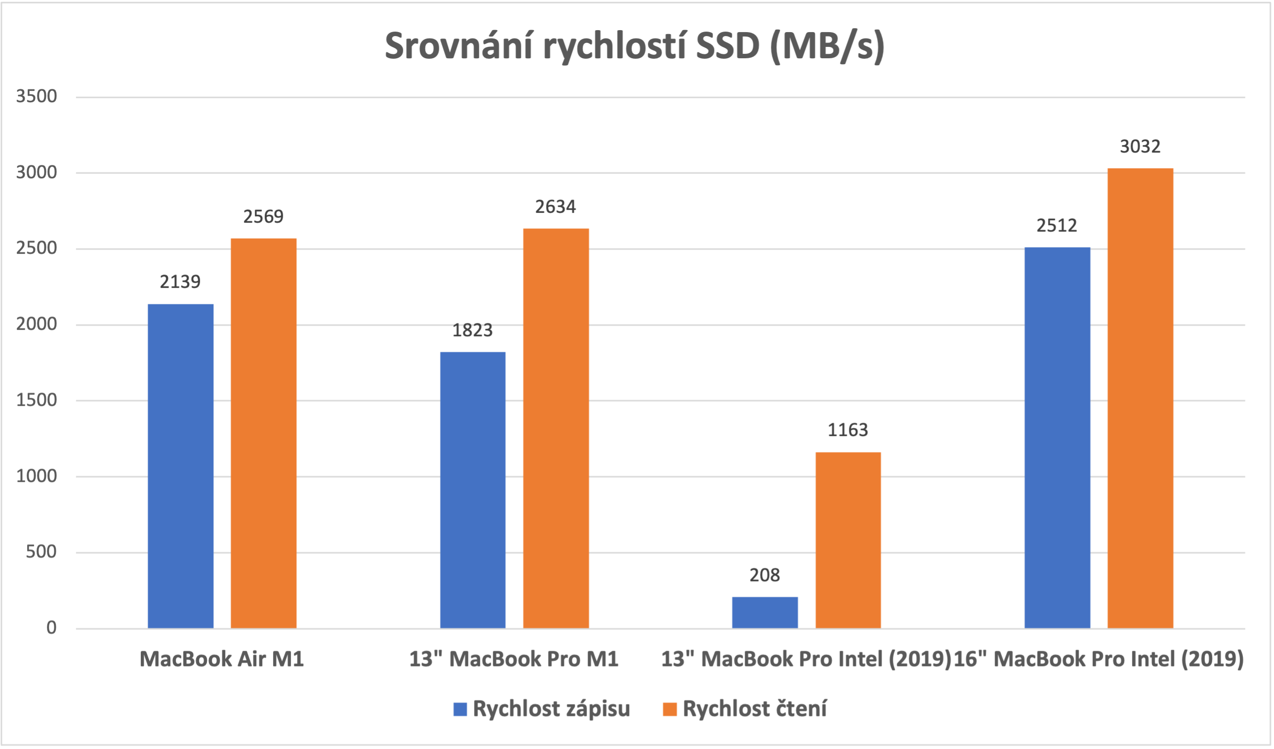 Včera jsme na našem magazínu uveřejnili článek, ve kterém jste se mohli dozvědět více o době nabíjení obou zmíněných MacBooků s M1, na našem sesterském magazínu jste si pak mohli přečíst srovnání výkonu MacBooku Air s M1 vs. 16″ MacBook Pro s procesorem Intel. Jednotlivých témat, kterým se v případě jablečných počítačů s M1 můžeme věnovat, je k dispozici opravdu nespočet a i na dnešek jsme si jedno takové připravili. Konkrétně se společně podíváme na srovnání rychlostí zápisu a čtení u MacBooků s M1 a MacBooků s Intelem. Abychom byli naprosto přesní, tak proti sobě postavíme MacBook Air M1, 13″ MacBook Pro M1, 13″ MacBook Pro Intel (2019) a 16″ MacBook Pro Intel (2019). Všechny tyto stroje jsou v základní konfiguraci, pouze zmíněný MacBook Air M1 má namísto základní kapacity úložiště navýšené na 512 GB. Na kompletní srovnání se můžete podívat na grafu níže.
