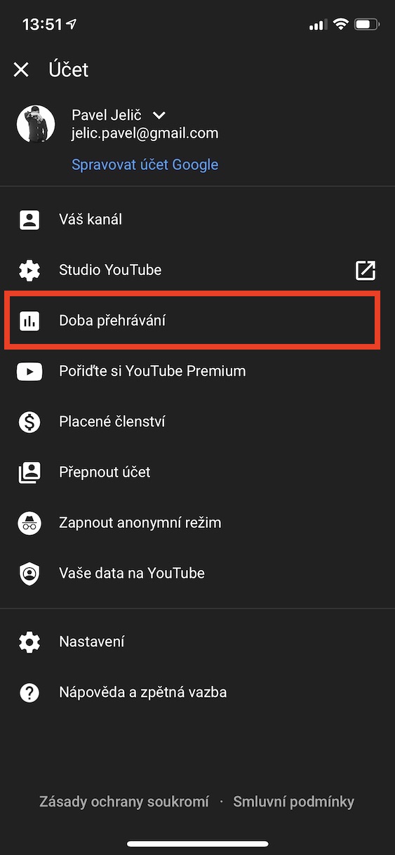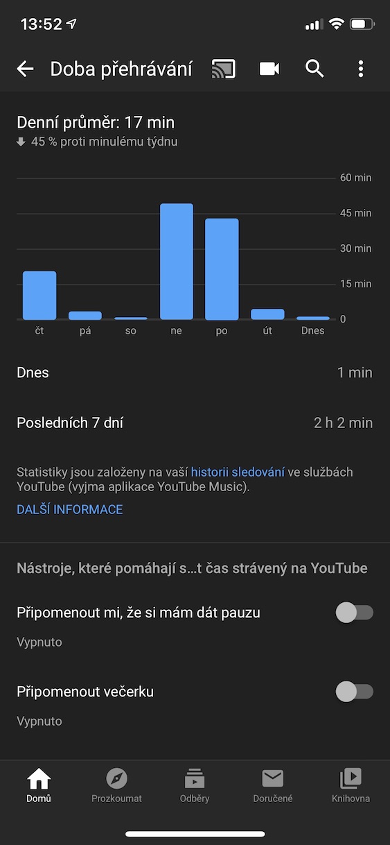 V jednom z výše uvedených odstavců jsme si řekli, jakým způsobem si můžete nastavit, aby vás aplikace YouTube po určité době upozornila na to, že si máte dát pauzu. S touto funkcí bude souviset také tento tip. Ukážeme si totiž, jakým způsobem můžete v YouTube zjistit, jak dlouhou dobu trávíte u videí. Veškerá tato data se zaznamenávají na pozadí a není třeba provádět aktivaci této funkce. Pro zobrazení dat klepněte vpravo nahoře na ikonu vašeho profilu, a poté na další obrazovce rozklikněte možnost Doba přehrávání, čímž se veškerá data zobrazí. Konkrétně se můžete podívat na denní průměr přehrávání a dobu přehrávání za dnešek či poslední týden. Níže si v této sekci můžete nastavit další funkce – konkrétně automatické přehrání dalšího videa, připomenutí večerky a již zmíněné připomenutí, že si máte dát pauzu.