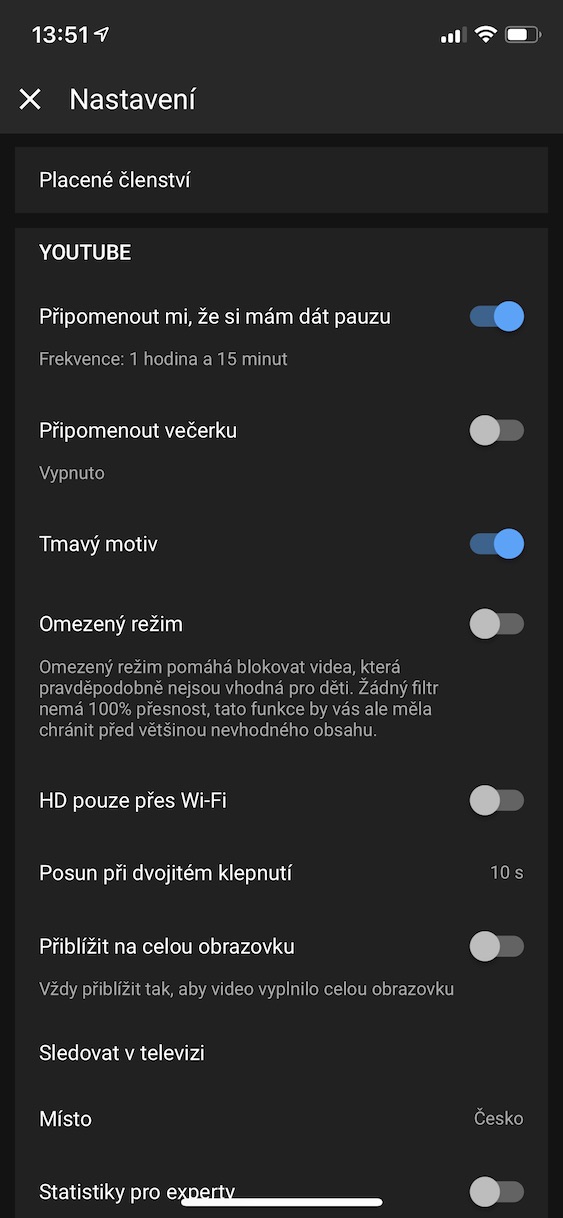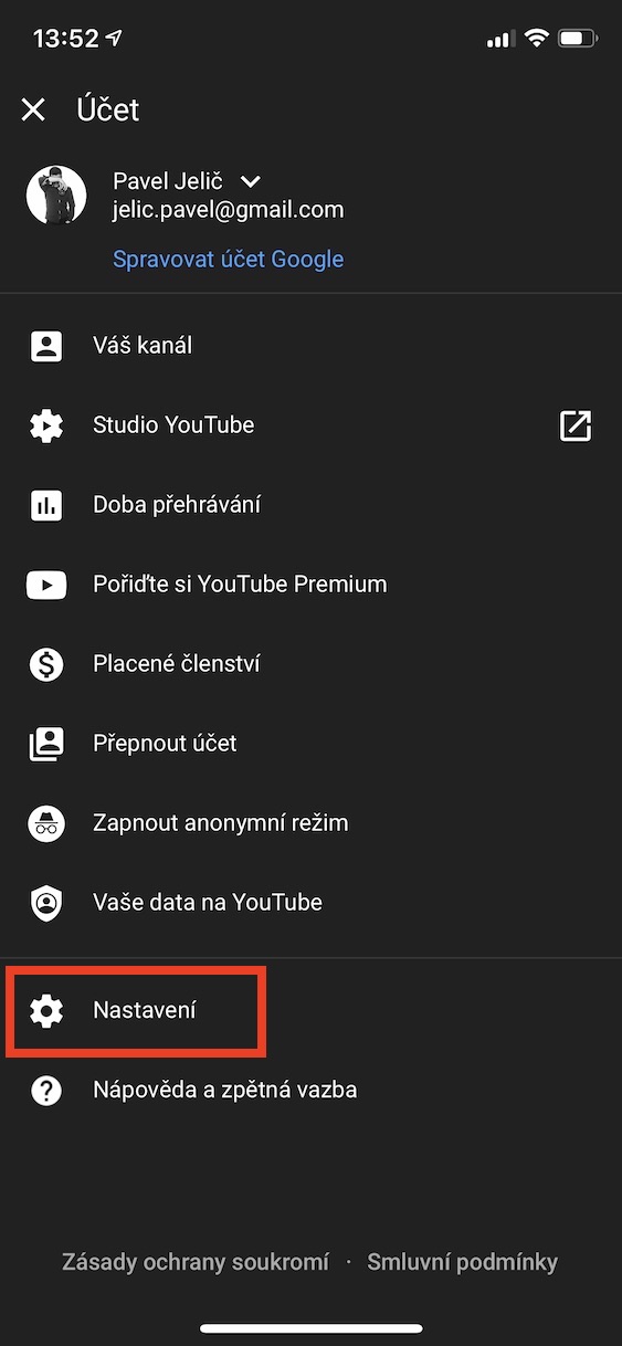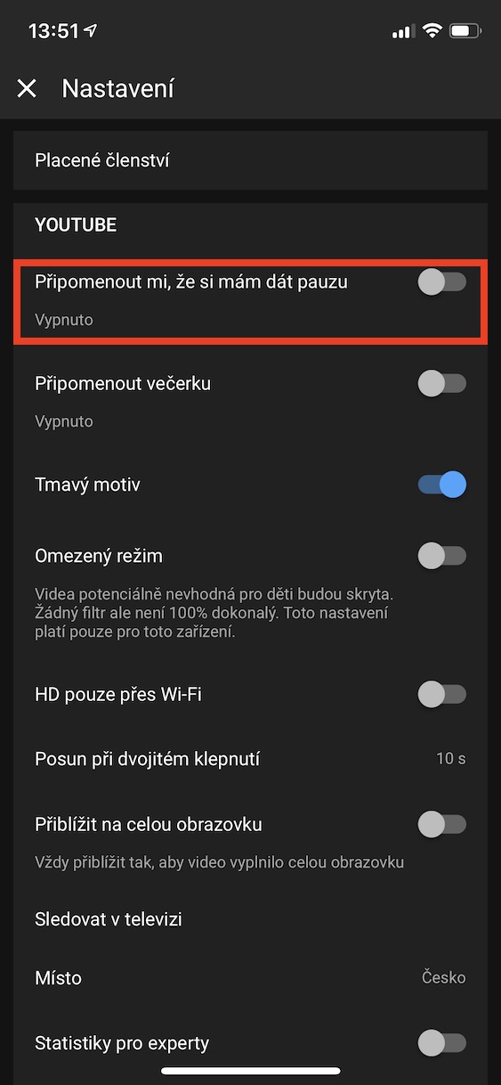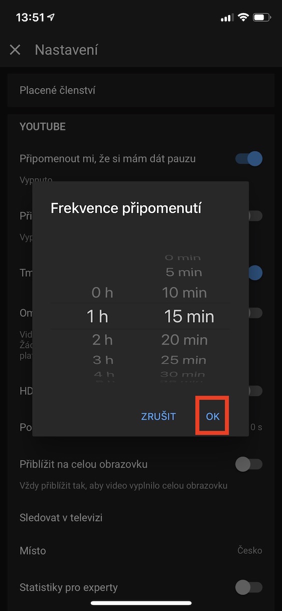 YouTube může uživatelům mimo jiné perfektně posloužit v případě, že potřebují zahnat nudu – dost možná jste YouTube v takové situaci nejednou použili i vy. Z jednoho videa, na které se chcete rychle podívat, se najednou může vyklubat deset dalších a vy zjistíte, že jste u YouTube strávili desítky minut či dokonce několik hodin. V aplikaci YouTube si však můžete nastavit, aby vám po určité době sledování videí přišla notifikace, která vám připomene, abyste si dali pauzu. Chcete-li připomenutí pauzy nastavit, tak vpravo nahoře klepněte na ikonu vašeho profilu. Otevře se menu, ve kterém dole klepněte na kolonku Nastavení. Na další obrazovce nyní aktivujte možnost Připomenout mi, že si mám dát pauzu. Zobrazí se malé okno, ve kterém už si jen nastavte frekvenci připomenutí, a volbu potvrďte klepnutím na OK.
