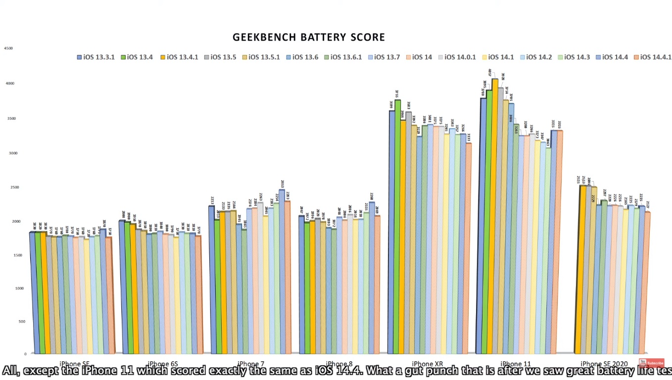 Hned úvodem se hodí říct, že žádný z testovaných modelů si bodově nepolepšil. IPhone SE 1. generace získal 3750 bodů, což znamená relativně značnou ztrátu oproti 3870, kterých dosáhl na iOS 14.4. IPhone 6s ztratil 40 bodů a skóre se tak zastavilo na 3770. Výrazný propad je k vidění u iPhonů 7 a 8. První jmenovaný ztratil z 2453 na 2283, druhý pak z 2268 na 2069 bodů. Pokles sledujeme i u iPhonu XR, který získal na aktuální verzi jablečného operačního systému 3133 bodů. Na iOS 14.4 přitom měl 3266. Nejlépe z testu vyšel iPhone 11, jenž získal shodné hodnocení jako na předchozí verzi – tedy 3315 bodů. Test završil iPhone SE 2. generace s 2127 body. Na iOS 14.4 obdržel 2215 bodů. Po stránce baterie tedy tato verze systému většině modelů rozhodně nesvědčí. Máte po aktualizaci na iOS 14.4.1 potíže s výdrží baterie?