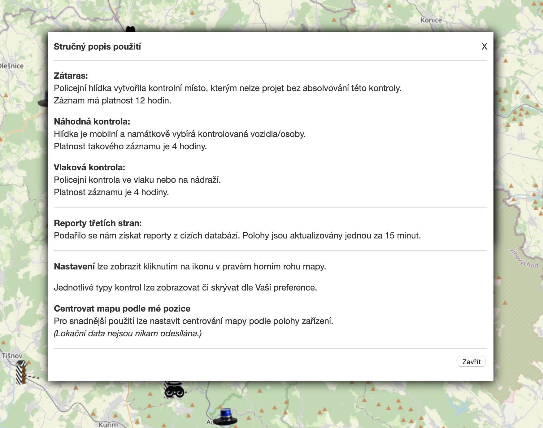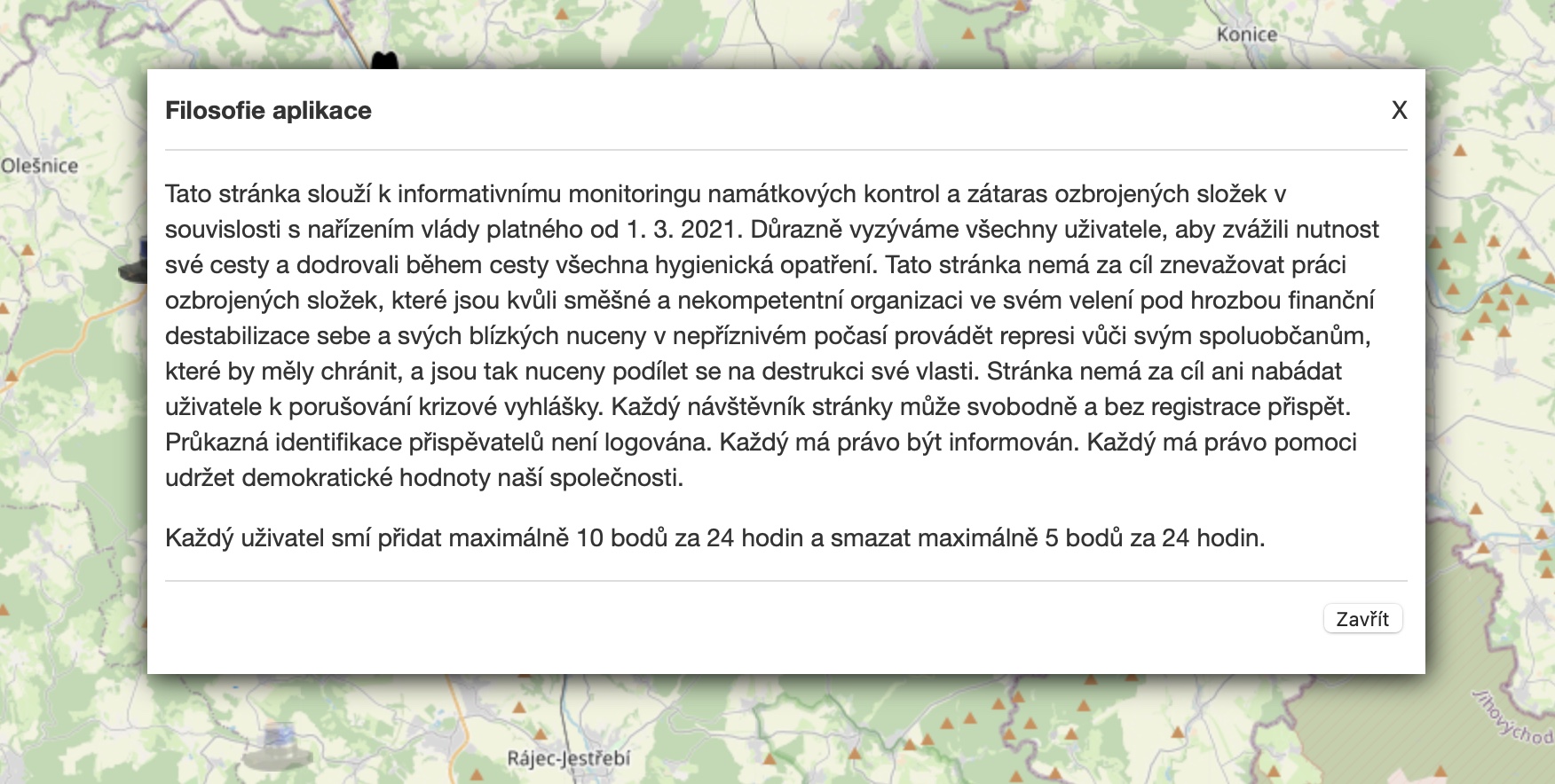 Fungování webové aplikace kontrolnibody.cz je ve své podstatě velmi prosté. Navigování z bodu A do bodu B sice nenabízí, zato však zobrazuje řidiči nahlášené policejní zátarasy, náhodné kontroly či vlakové kontroly na území České republice. Do nahlašování kontrol se pak může zapojit naprosto každý a to bez jakékoliv registrace, díky čemuž je již nyní aplikace velmi hojně využívána. Její filozofie však alespoň podle tvůrců není znepříjemňovat policii její práci. “Tato stránka slouží k informativnímu monitoringu namátkových kontrol a zátaras ozbrojených složek v souvislosti s nařízením vlády platného od 1. 3. 2021. Důrazně vyzýváme všechny uživatele, aby zvážili nutnost své cesty a dodrovali během cesty všechna hygienická opatření. Tato stránka nemá za cíl znevažovat práci ozbrojených složek, které jsou kvůli směšné a nekompetentní organizaci ve svém velení pod hrozbou finanční destabilizace sebe a svých blízkých nuceny v nepříznivém počasí provádět represi vůči svým spoluobčanům, které by měly chránit, a jsou tak nuceny podílet se na destrukci své vlasti. Stránka nemá za cíl ani nabádat uživatele k porušování krizové vyhlášky. Každý návštěvník stránky může svobodně a bez registrace přispět. Průkazná identifikace přispěvatelů není logována. Každý má právo být informován. Každý má právo pomoci udržet demokratické hodnoty naší společnosti,” stojí v jejím popisku.