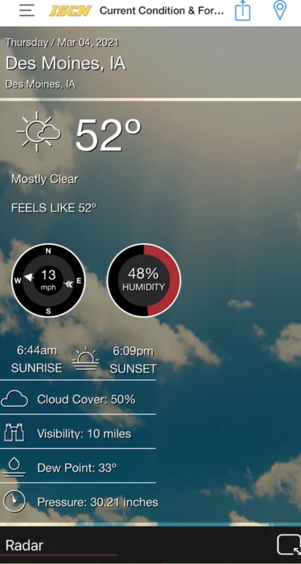 Aplikace ISCN Weather nabízí každodenní podrobnou a spolehlivou předpověď počasí pro váš iPhone. Najdete zde jak klasickou předpověď, tak i záběry z radaru, satelitní zobrazení nebo třeba varování před výraznými změnami počasí. V aplikaci si můžete také nastavit vybrané oblasti, u kterých chcete být včas informování o změnách počasí.