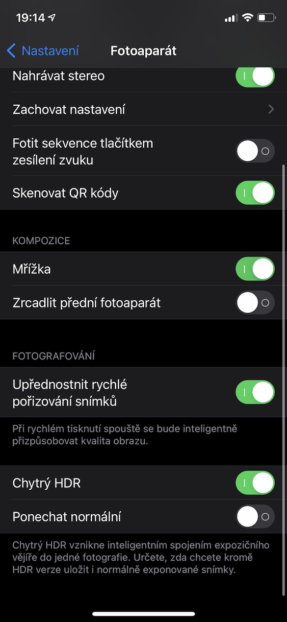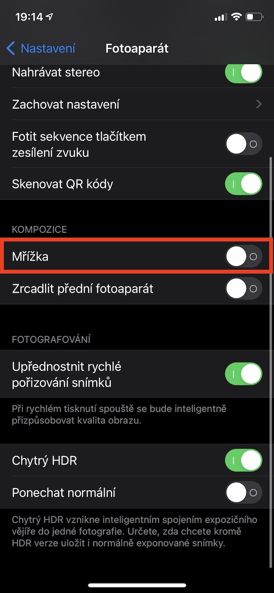 Při focení byste měli využívat jakési pravidlo třetin. Jedná se o naprosto základní pravidlo, které se mimo fotografování využívá také ve výtvarném umění. Cílem pravidla třetin je umístit předměty a oblasti zájmu do blízkosti jedné z linií tak, aby byl obraz rozdělen na tři stejné části. Dalším cílem je umístit objekty do průsečíků třetinových linií. Umístění objektů v těchto místech učiní fotografii mnohem zajímavější, energičtější a napínavější než jednoduché a nezajímavé zobrazení hlavního motivu uprostřed. Abyste si obraz na třetiny nemuseli složitě rozdělovat v hlavě, tak vám v tom může pomoci mřížka, kterou si můžete aktivovat i ve Fotoaparátu na iPhone. Stačí, abyste přešli do Nastavení -> Fotoaparát, kde v kategorii Kompozice aktivujte možnost Mřížka.