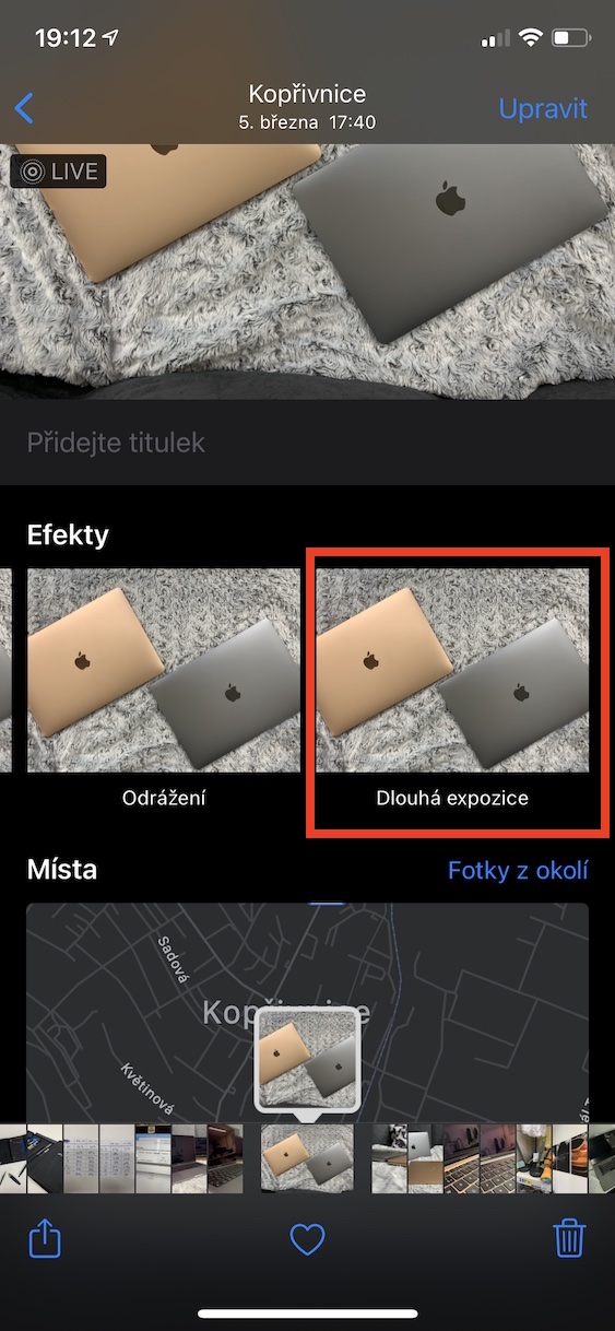 Jestliže patříte mezi fotografy, kteří se vyznají, tak vám nejspíše nemusím pojem „dlouhá expozice“ vysvětlovat. Pro ty méně zkušené se jedná o speciálně vytvořené snímky, u kterých se při focení nastaví dlouhá doba závěrky. Nejčastěji se takové snímky vytváří například u tekoucí vody, anebo třeba v noci nad dálničním mostem. V případě tekoucí vody se voda uhladí a rozmaže, z dálničního mostu pak v noci můžete pomocí dlouhé expozice nechat kreslit světla aut. Přesně tento režim lze aktivovat i přímo na iPhone. Stačí otevřít aplikaci Fotky, a poté najít libovolné Live Photo, které rozklikněte. Poté po fotce přejeďte prstem zdola nahoru a v efektech klepněte na Dlouhá expozice.