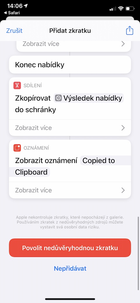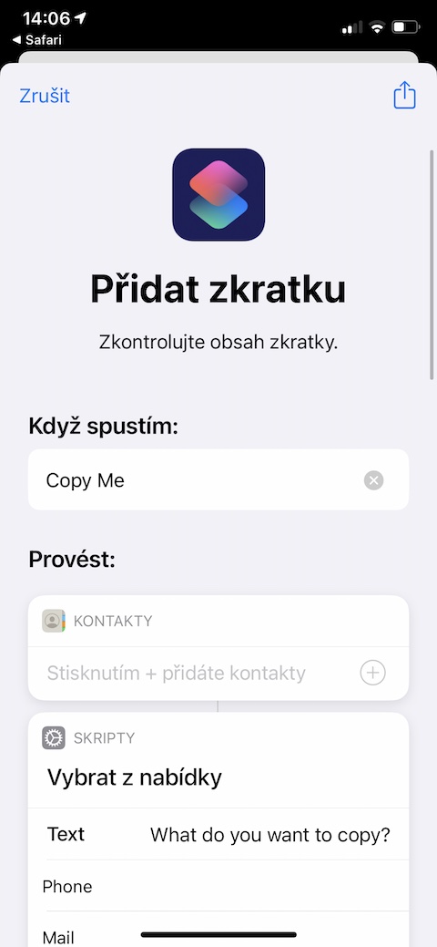 Zkratka s názvem CopyMe se vám stoprocentně bude hodit pokaždé, když budete potřebovat někomu snadno a rychle odeslat své kontaktní údaje. Tato zkratka totiž dokáže z kontaktů ve vašem iPhonu spolehlivě zkopírovat vše potřebné, a vy už jen vložíte obsah tam, kam je to potřeba. Zkratka CopyMe vyžaduje přístup ke kontaktům na vašem iPhonu, vy si v rámci zkratky můžete vybrat, jaký druh kontaktu chcete v danou chvíli zkopírovat.