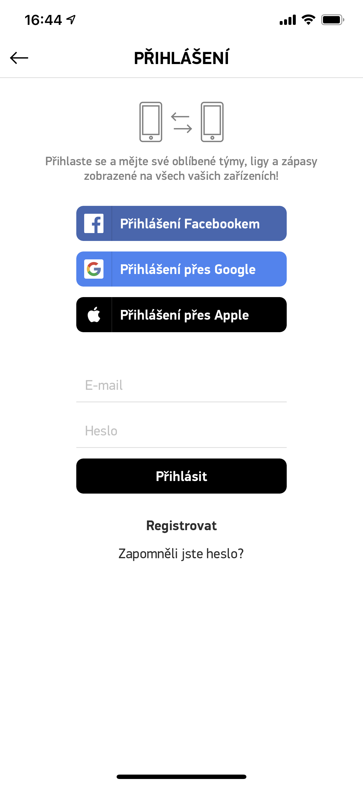 Důvod k tomu být v aplikaci přihlášený, je jednoduchý. Personalizace informací, výběr týmů a sportů, které vás zajímají, ale i určení notifikací a dalších podrobností jistě chvíli zabere. Tyto informace jsou ale spjaté s vaší uživatelským účtem, takže ta samá uvidíte po přihlášení nejen v telefonu, ale i tabletu a webovém prohlížeči. Po volbě Nastavení k tomu stačí zvolit nabídku Přihlásit se. To můžete učinit nejen za pomoci Facebook účtu, ale i toho u společnosti Google nebo lze zvolit přihlášení přes Apple. Nechybí ani registrace pomocí e-mailové adresy a zvoleného hesla.