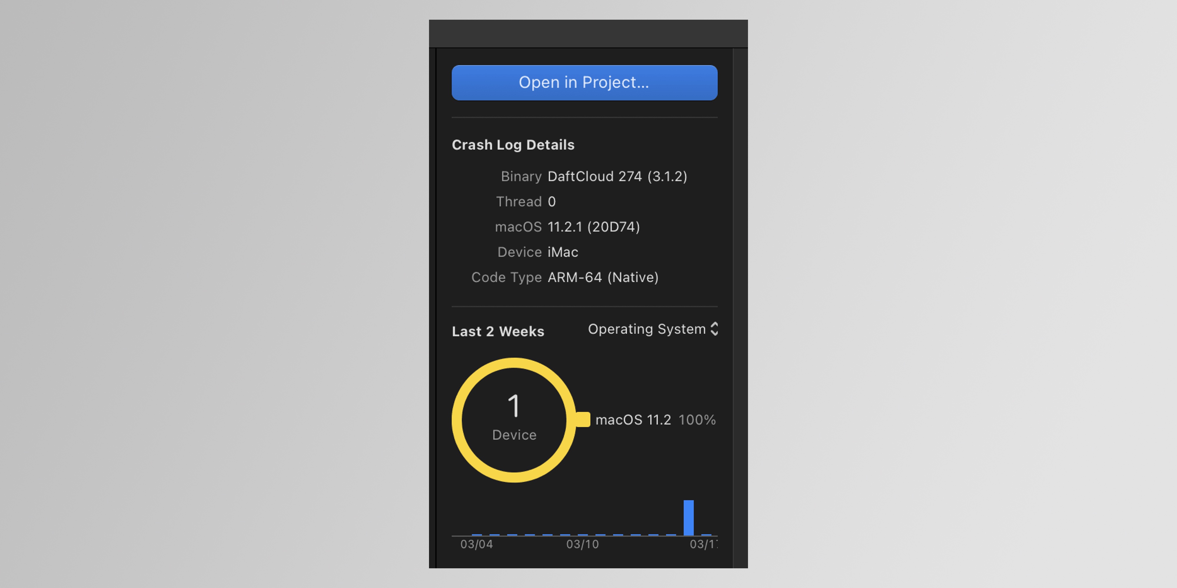 Nahlašujete při potížích s aplikacemi jejich vývojářům chyby přes vyskakovací okna? Testeři nového iMacu v Applu ano. A právě jedno takové nahlášení testování iMacu s Apple Silicon odhalilo, jelikož vývojáři aplikace DaftCloud jeho Xcode napojený právě na databázi nahlašovaných chyb problém nahlášený přes tento Mac odhalil. Vyplývá to jak ze screenshotu, který poskytl portálu 9to5mac, tak i z dat, která byla v souvislosti s chybou z Macu vývojáři automaticky odeslána. Bohužel, potvrzení pravosti a obecně toho, že se problém udál na iMacu s čipem Apple Silicon je zároveň jediná věc, která lze z vývojářského rozhraní pro kontrolu nahlášených chyb vyčíst – tedy vyjma toho, že na Macu běžel macOS 11.2.1.