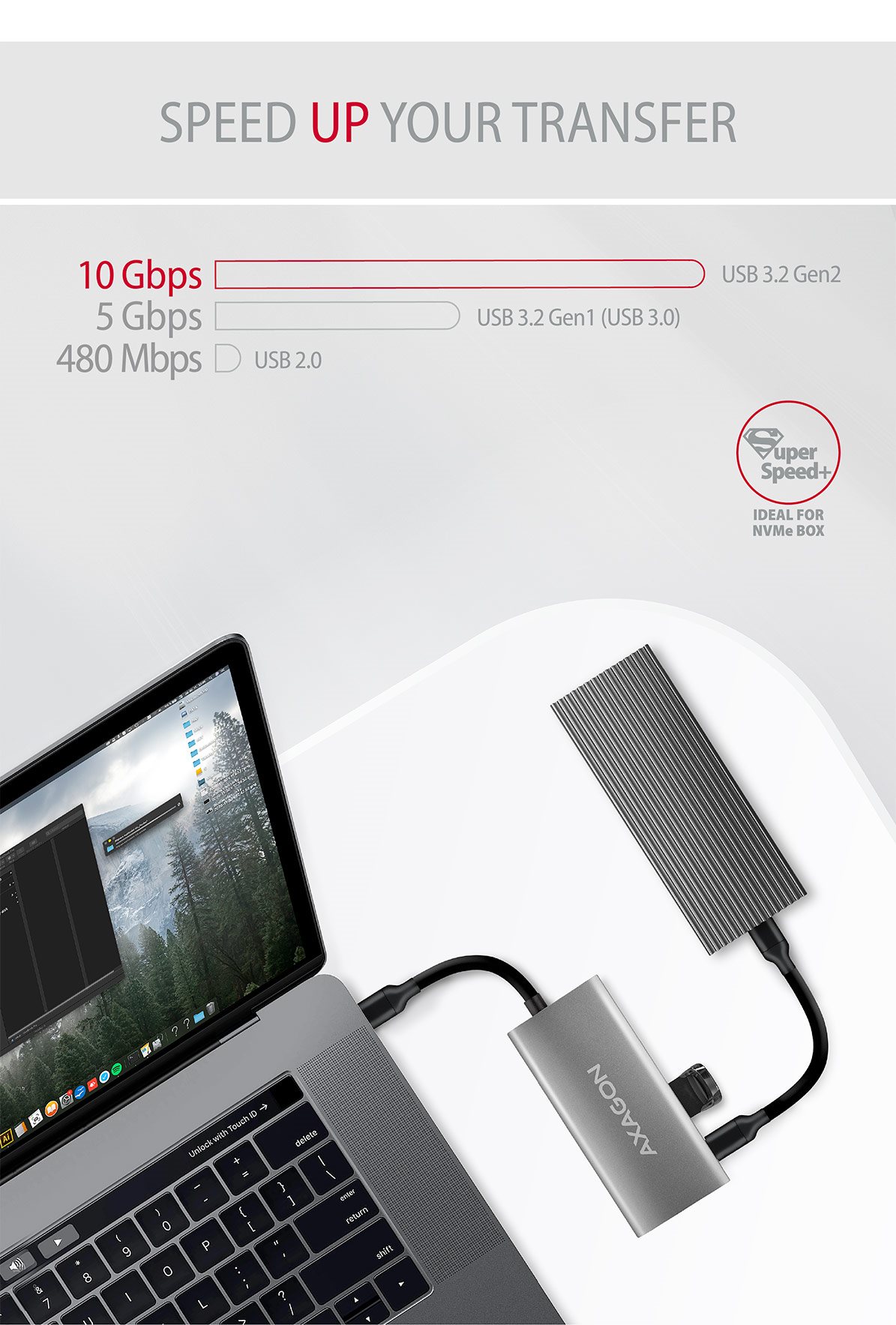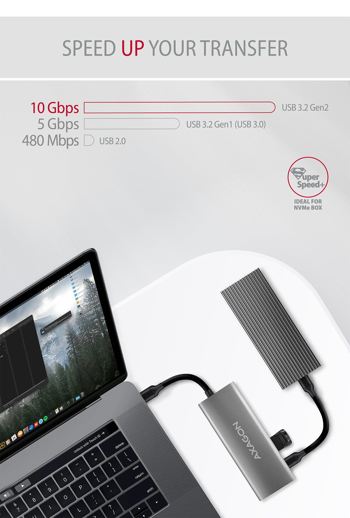 Díky pokročilému rozhraní USB 3.2 Generace 2 můžete ke všem výstupům připojit vysokorychlostní zařízení jako NVMe M.2 externí disky s až 2x vyšší rychlostí 10 Gbps oproti standardním hubům Generace 1. HUB navíc zvládne trvalé připojení několika externích disků současně a USB-C porty dovolí nabíjení telefonů i tabletů proudem až 3A.
