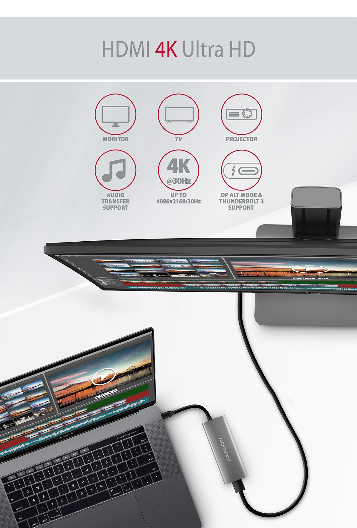 HDMI výstup poskytuje kvalitní obraz až do rozlišení 4K/30Hz Ultra HD a podporuje přenos vícekanálového zvuku. Pro správné fungování video výstupu je nutné, aby USB-C port notebooku podporoval DisplayPort Alternate Mode (DP Alt Mode) nebo Thunderbolt 3.