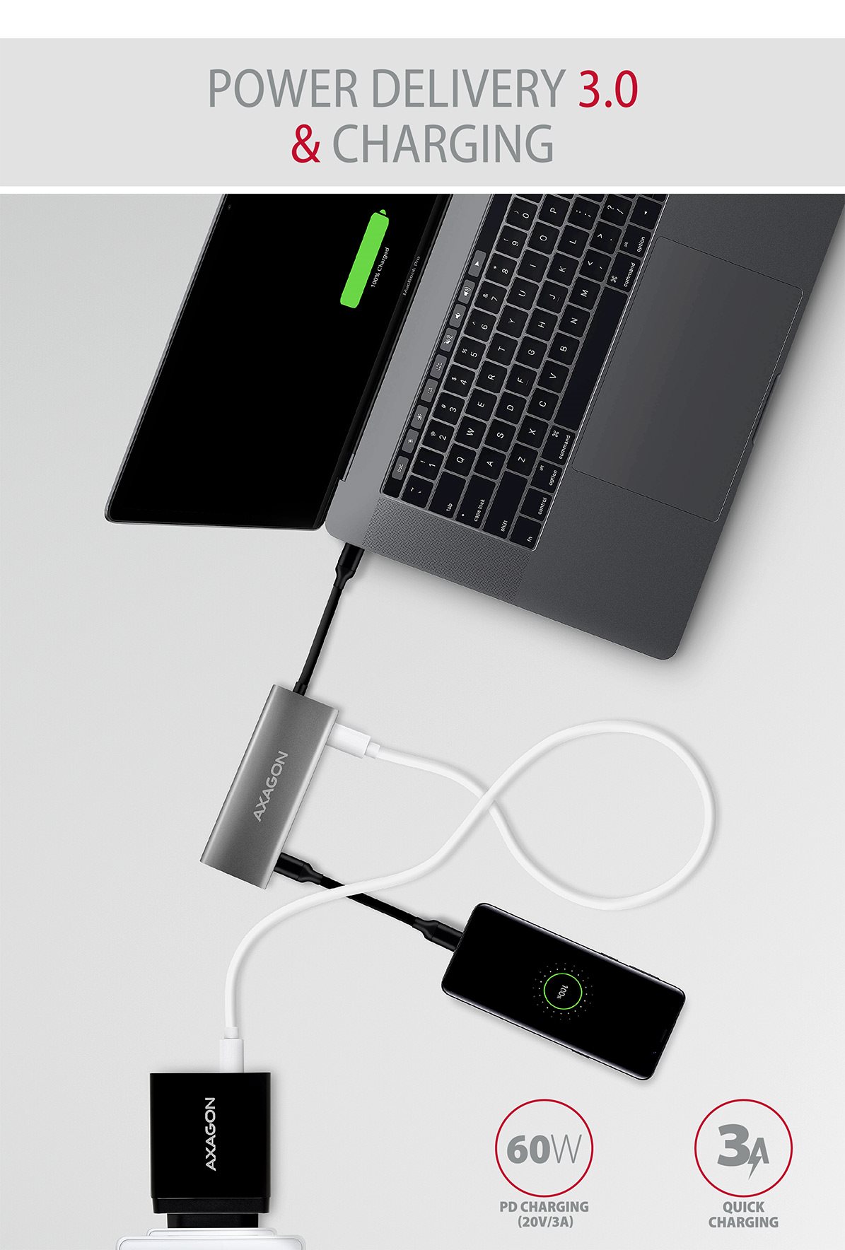 Vybavenější kolega předchozího modelu má stejné tělo, ale rozšíří vaše zařízení o pětici portů. Zároveň získáte možnost nabíjení notebooku pomocí technologie Power Delivery 3.0 o výkonu až 60 W. HUB vám tak poskytne jednoduchou a skladnou dokovací stanici. Zapojíte do něj USB-C Power Delivery nabíječku a připojíte ho k notebooku. Ušetříte tak jeden port, což se může hodit. Podmínkou je zařízení s podporou nabíjení z USB-C portu pomocí Power Delivery a vhodná PD nabíječka.