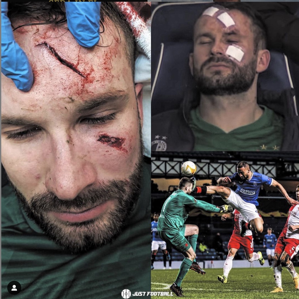 Včerejší výhra v osmifinále pražské Slavie na půdě skotských Rangers se rodila v urputných bolestech – a to doslova. Hráči skotského celku totiž hráli naprosto brutálním stylem, který po zhruba hodině hry odnesla jedna z největších hvězd Slavie – golman Ondřej Kolář. Ten po střetu s kopačkou protihráče skončil na nosítkách kvůli hluboké tržné ráně na čele i pod okem. Tato zranění si vyžádala dobrých 10 stehů a další hospitalizaci Koláře v nemocnici. Kromě tržných ran si totiž také odnesl zlomeninu v obličeji. Na to, jak zranění vypadají, se můžete podívat níže.