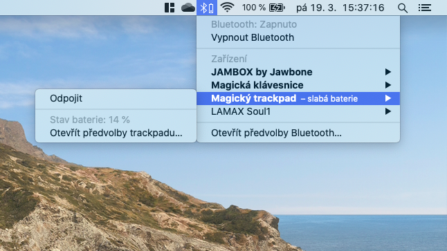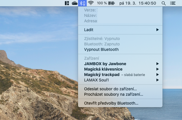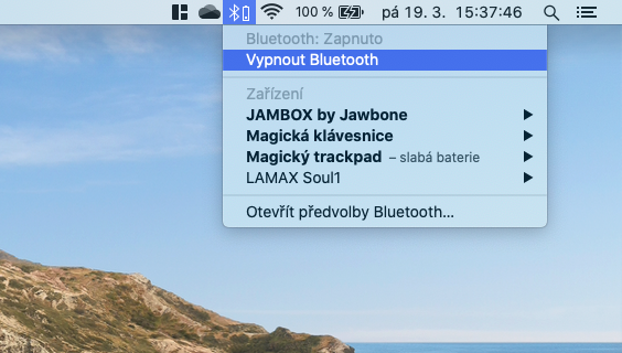 - Vypněte zařízení Bluetooth a znovu jej zapněte. To samé můžete udělat s připojením na Macu (Symbol Bluetooth -> Vypnout Bluetooth)