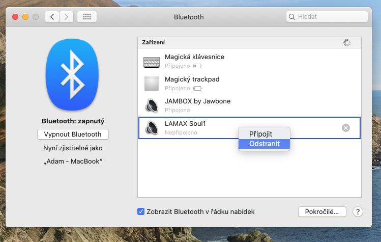 - Můžete také zařízení Bluetooth ručně odpojit a znovu jej připojit, popřípadě jej odstranit a nově spárovat, abyste zjistili, zda došlo k případnému zlepšení (Předvolby systému -> Bluetooth -> pravý klik na zařízení a Odstranit)