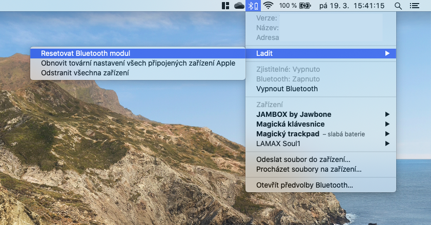 Problém je v tom, že v OS Monterey nenabíhá vůbec možnost ladit. Je tam viditelná jen název a verze Bluetooth. Proto bych se rád zeptal, na jakou verzi je tento návod dělaný a zda by nebylo možné udělat i novější, kde by bylo jasné, jak resetovat Bluetooth modul.