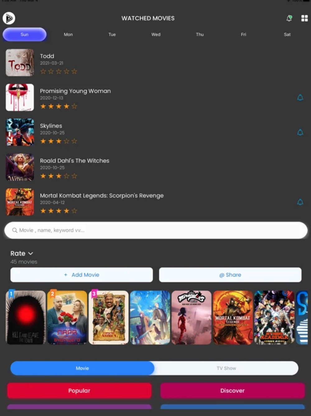 Watched je skvělá a užitečná aplikace pro všechny milovníky filmů. Díky tomuto nástroji můžete kdykoliv a kdekoliv objevovat nový obsah ke zhlédnutí, načerpat filmovou inspiraci, pročíst si nejžhavější novinky, ale také se informovat o premiérách filmů, zjišťovat si zajímavé informace a hodnotit zhlédnuté filmy.
