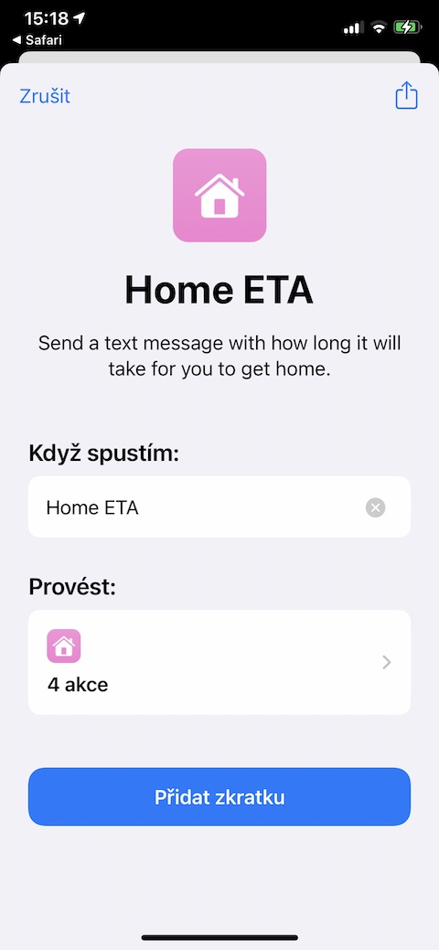 S pomocí zkratky s názvem Home ETA můžete vybranému kontaktu odeslat zprávu o tom, za jak dlouho dorazíte do vámi určené polohy. Zkratka Home ETA kromě kontaktů pochopitelně spolupracuje také s nativními Apple Maps na vašem iPhonu. Zkratka funguje tak, že do příslušných řádků nejprve zadáte údaje o vaší aktuální poloze a o cílové lokaci, a poté zadáte kontaktní údaje člověka, kterého chcete o svém příjezdu či příchodu informovat.