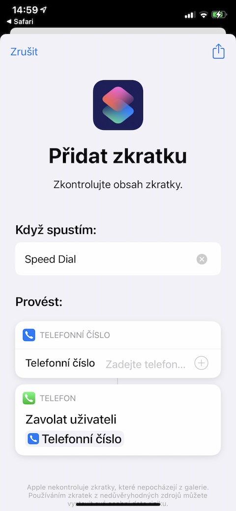 Jak název napovídá, umožní vám zkratka Speed Dial kdykoliv a odkudkoliv rychle vytočit vámi vybrané číslo z vašeho seznamu kontaktů. Ke zkratce můžete přidat buďto hlasový příkaz, nebo si ji přidat na plochu vašeho iPhonu pro okamžitý přístup. Zkratka Speed Dial vyžaduje přístup k vašim kontaktům. Pro přidání zkratky na plochu spusťte Zkratky, vlevo dole klepněte na Moje zkratky a poté v pravém horním rohu karty vybrané zkratky klepněte na ikonku tří teček. Poté opět vpravo nahoře klepněte na tři tečky a zvolte Přidat na plochu.