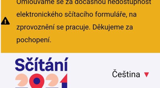Dobrý den. Elektronický sčítací formulář je dočasně nedostupný kvůli enormnímu zatížení systému od dnešních 8:15 hodin. Příčiny analyzujeme a na zprovoznění intenzivně pracujeme. Údaje z již vyplněných sčítacích formulářů nejsou samozřejmě ohroženy. Děkujeme za pochopení!