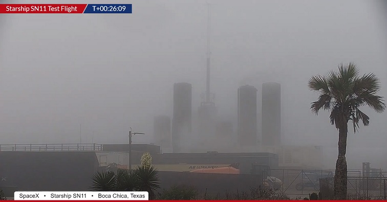 Tak se prototyp SN11 přeci jen testu dočkal. Kdo z vás sledoval živý přenos, pravděpodobně je v rozpacích. Během testu vypadl obraz a ozvala se ohlušující rána. Jako první se nabízí, že SN11 explodoval. Máme ale velmi málo informací. Jak můžete vidět na fotografii pod odstavcem, v Boca Chica je momentálně mlha. Nemáme tedy ani vizuální potvrzení. Na oficiální prohlášení čekáme.