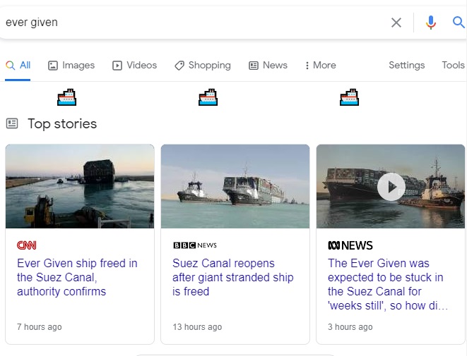 O zablokování Suezského průplavu lodí Ever Given pravděpodobně v posledních dnech slyšel každý z vás. Nyní už je ale vše v pořádku a po svém vysvobození lodě oslavil i Google. Pokud do vyhledávače napíšete „suez canal“ nebo „Ever Given“, pod vyhledávací lištou se vám ukáže animace plující lodě.