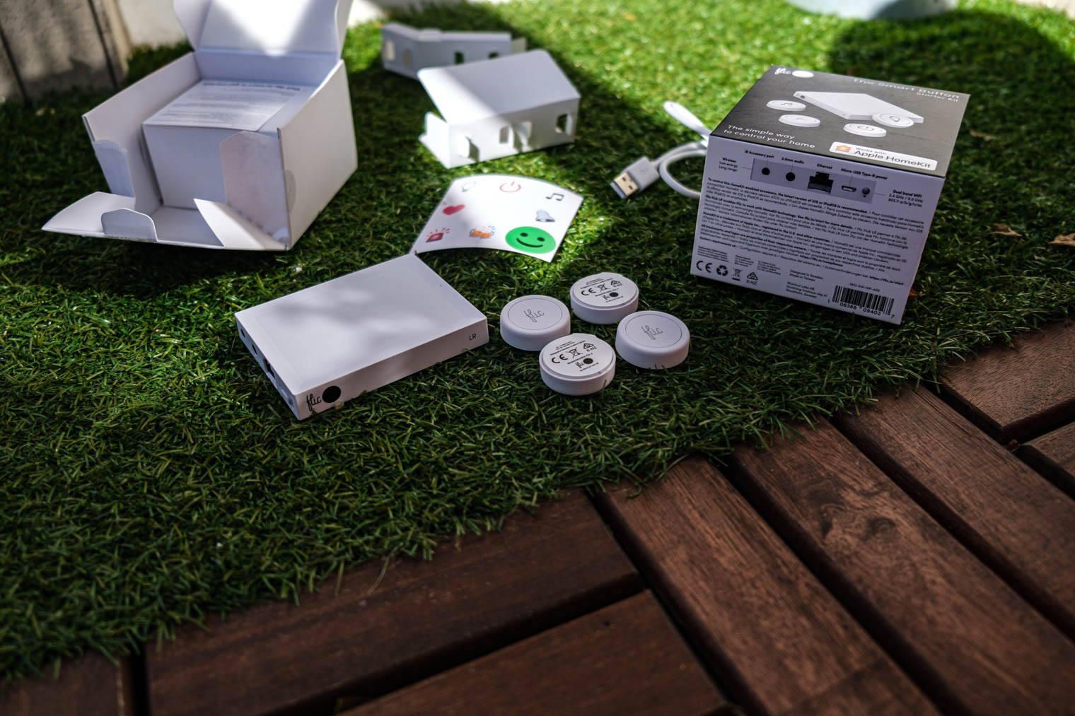 V redakci máme k dispozici Flic The Smart Button Starter Kit který, jak již název napovídá, je základní stavební jednotkou celého ekosystému chytrých tlačítek. V balení tak najdeme jeden Flic LR Hub, jež slouží pro propojení jak jednotlivých tlačítek mezi sebou, tak jako komunikační centrála v rámci domácí chytré infrastruktury. Hub je možné využívat samostatně a prostřednictvím doprovodné aplikace Flic využívat jeho služby, nebo je možné jej integrovat prostřednictvím kompatibility s HomeKitem v aplikaci Domácnost. O tom však později. Kromě centrálního hubu se v balení dále nachází napájecí kabel (který je však relativně krátký – cca 30 centimetrů), napájecí adaptér se třemi světovými koncovkami, a především pak čtyři samostatná tlačítka s nějakými samolepkami navíc.