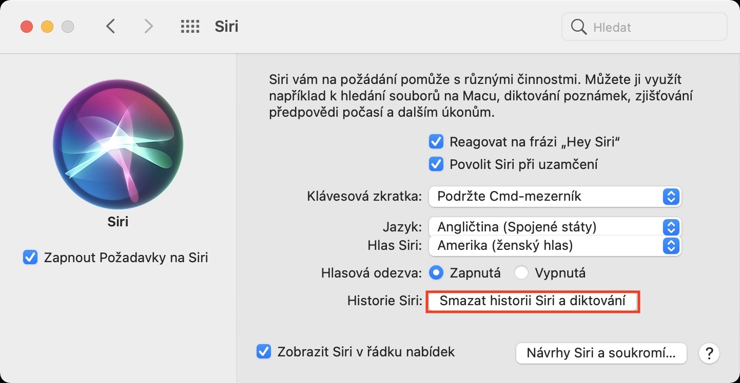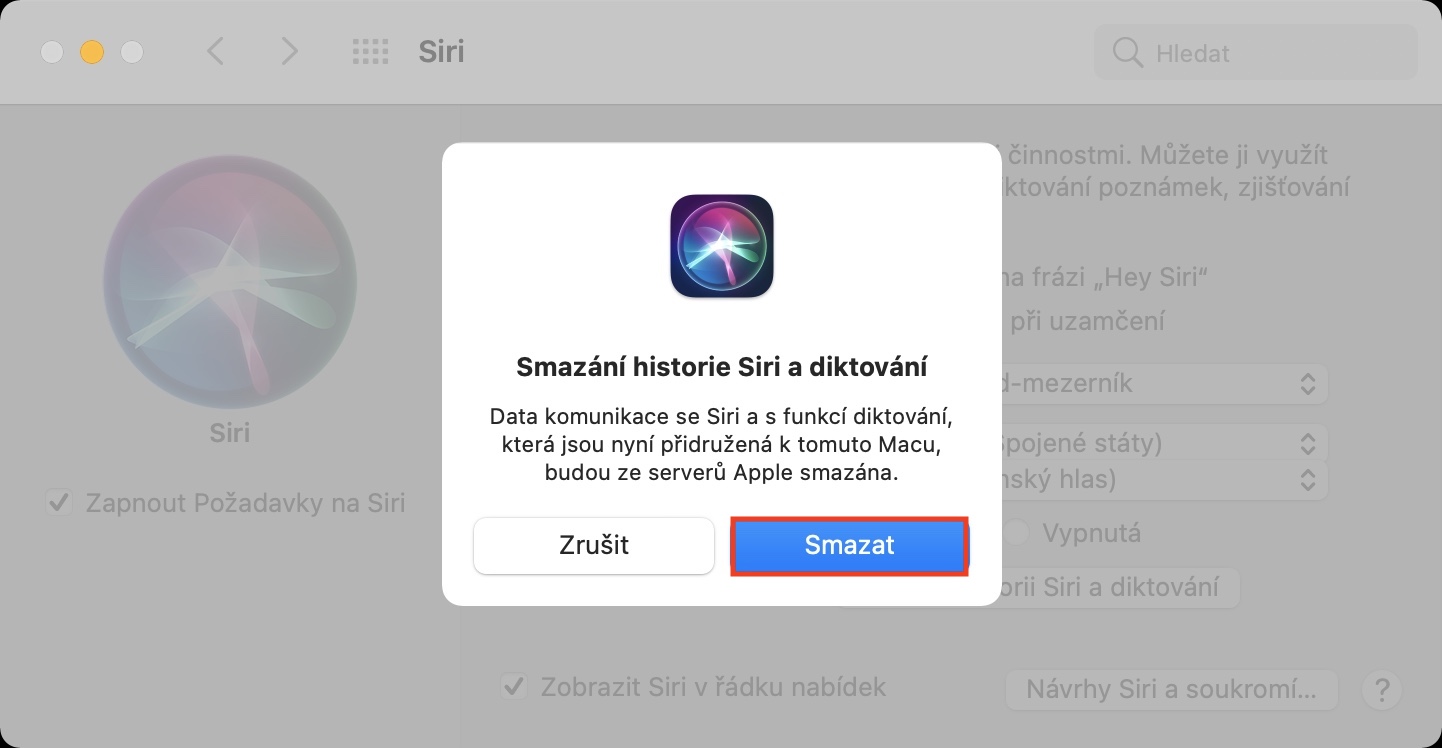 Výše uvedeným způsobem docílíte toho, že deaktivujete odesílání dat, která vzniknou při používání Siri, na servery Applu. Chcete-li provést vymazání aktuálních dat a historie používání Siri na Macu, tak otevřete Předvolby systému, a poté se přesuňte do sekce Siri. Zde už jen jednoduše stačí, abyste klepnuli na tlačítko Smazat historii Siri a diktování. Zobrazí se dialogové okno, ve kterém akci klepnutím na Smazat potvrďte. Tímto odstraníte ze serverů Applu veškerá uložená data, která se pojí s využíváním Siri na vašem Macu.
